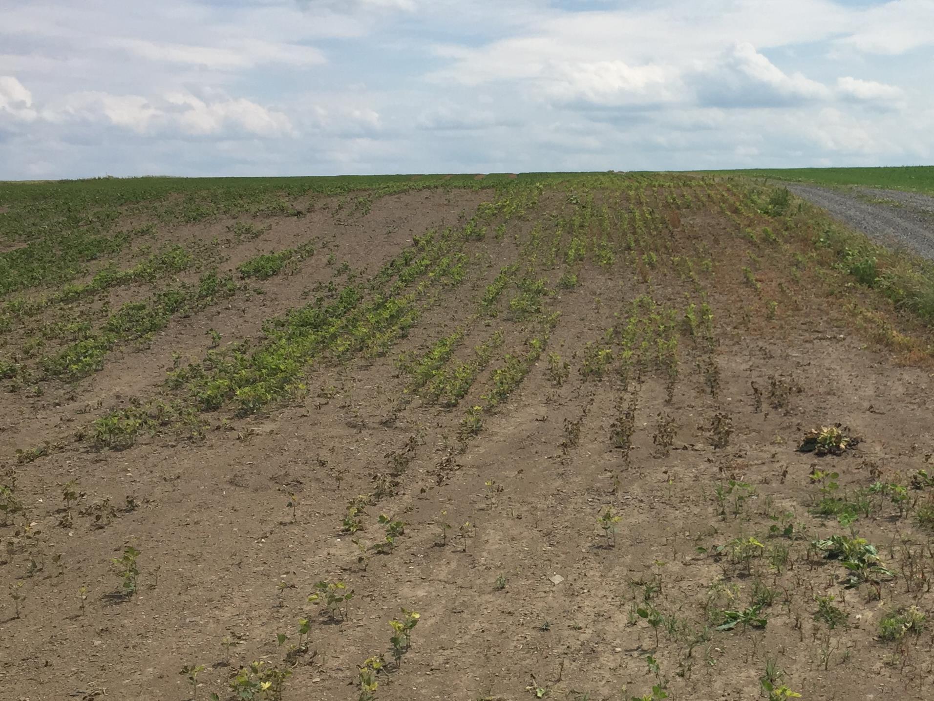 Description: Mortalité importante de plants de soya, suite à une pulvérisation d’herbicides contenant des résidus de mésotrione (et d’atrazine). L’application de mésotrione dans une culture de soya peut occasionner d’importants dommages, des pertes de rendement voire la mort de la culture.