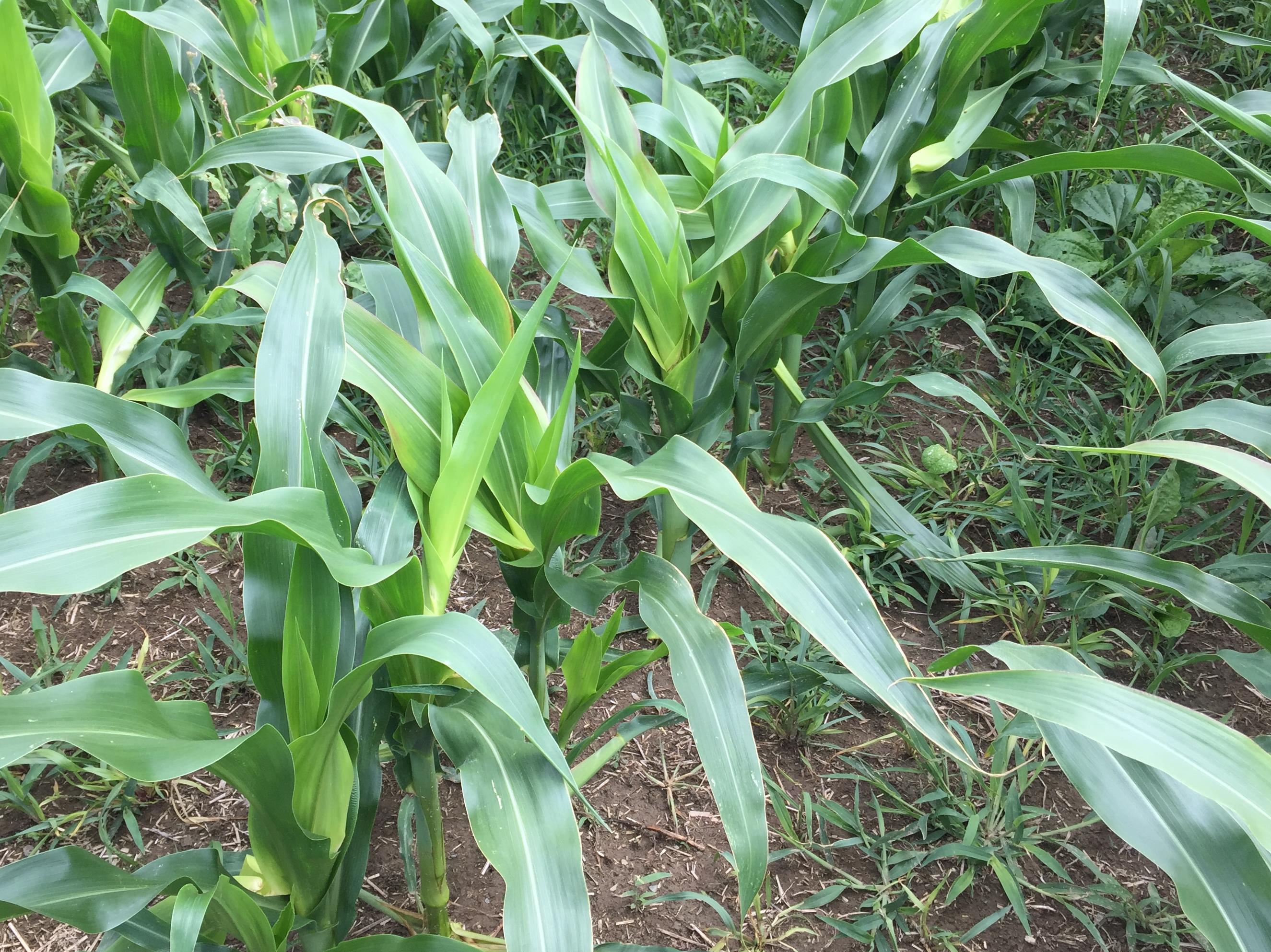 Description: Les feuilles terminales de plants de maïs grain (hybride conventionnel) montrent un jaunissement à blanchiment, débutant à la base et progressant vers l’apex du limbe. Une déformation (courbure de la tige) a aussi été observée sur les plants (non visible ici). Ces symptômes sont présents sur l'ensemble du champ: ils sont le résultat après une semaine de l'application tardive, soit après le stade de croissance recommandé pour la culture du maïs (1re à 8e feuille), de l’herbicide ACCENTMD (nicosulfuron) sous de très chaudes températures. Cet herbicide de contact est homologué dans la culture du maïs cependant son étiquette mentionne que la chaleur et l’humidité intensifient son action. Certains hybrides de maïs seraient aussi plus sensibles au nicosulfuron. L’herbicide BATTALIONn® (emballage commercial : s-métolachlore/rimsulfuron/dicamba) avait aussi été appliqué en pré-semis dans le champ.