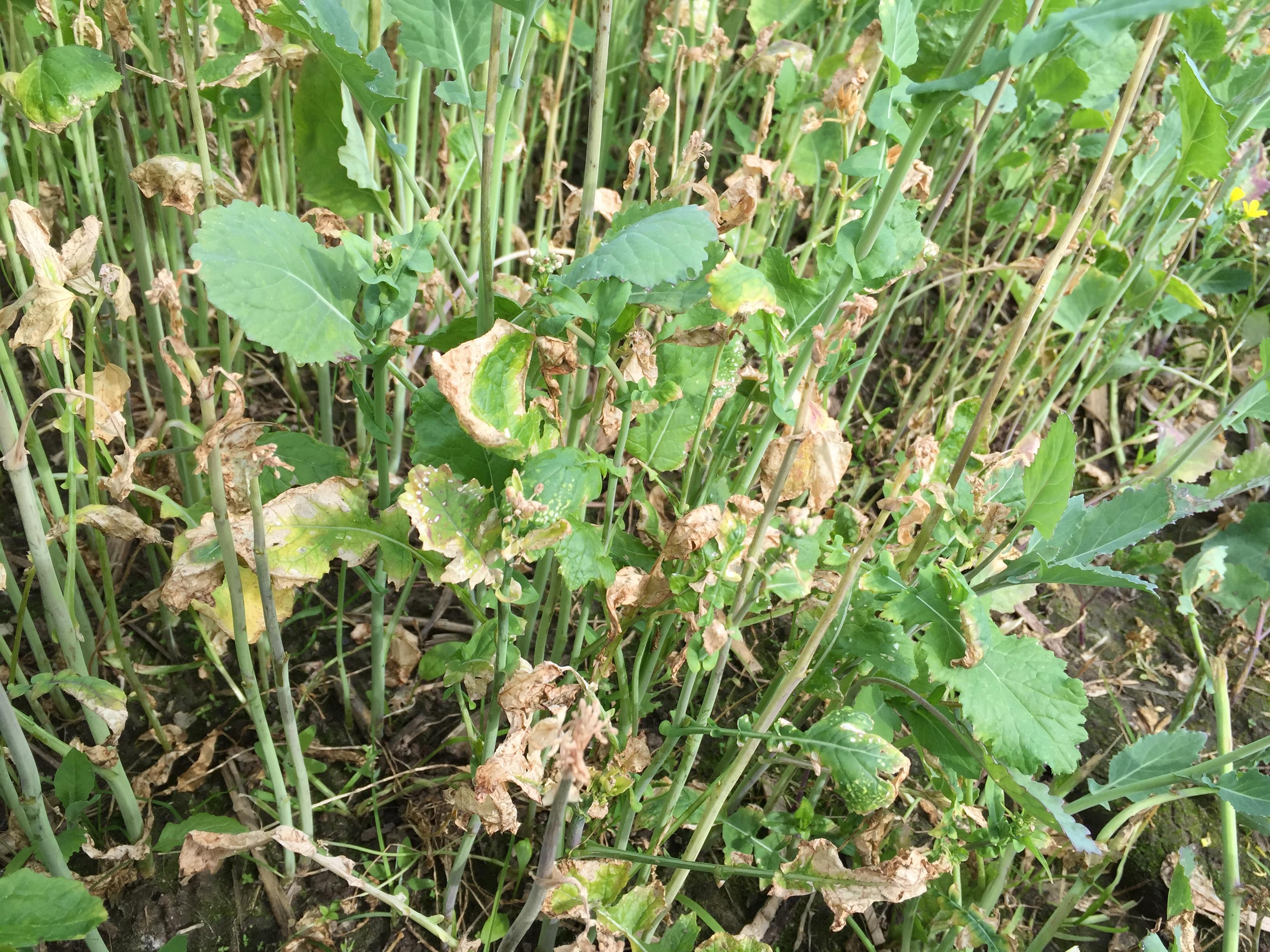 Légende: Plants de canola avec jaunissement et brûlure du feuillage