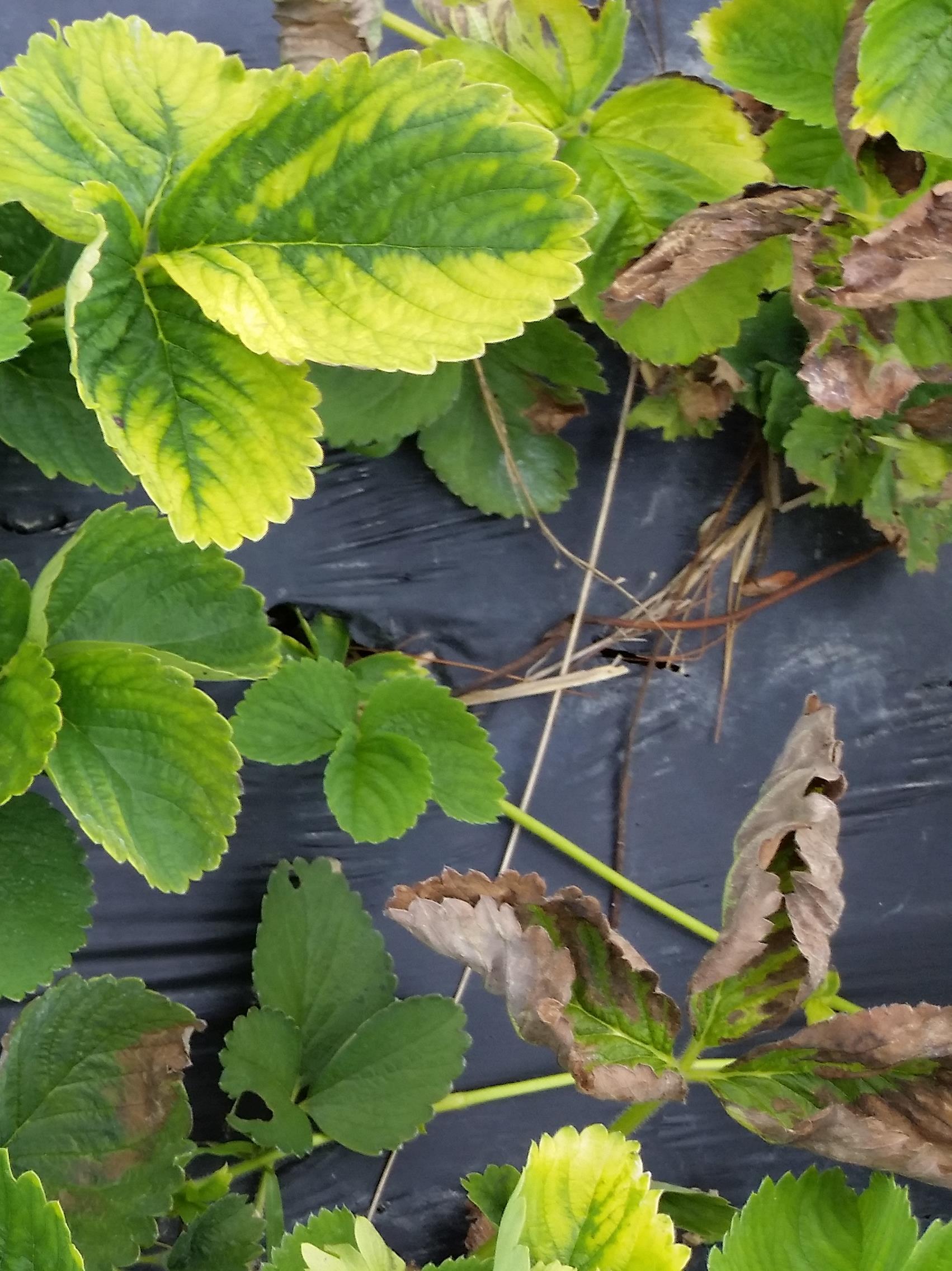 Légende: Feuilles de fraisiers avec brûlures et blanchiment