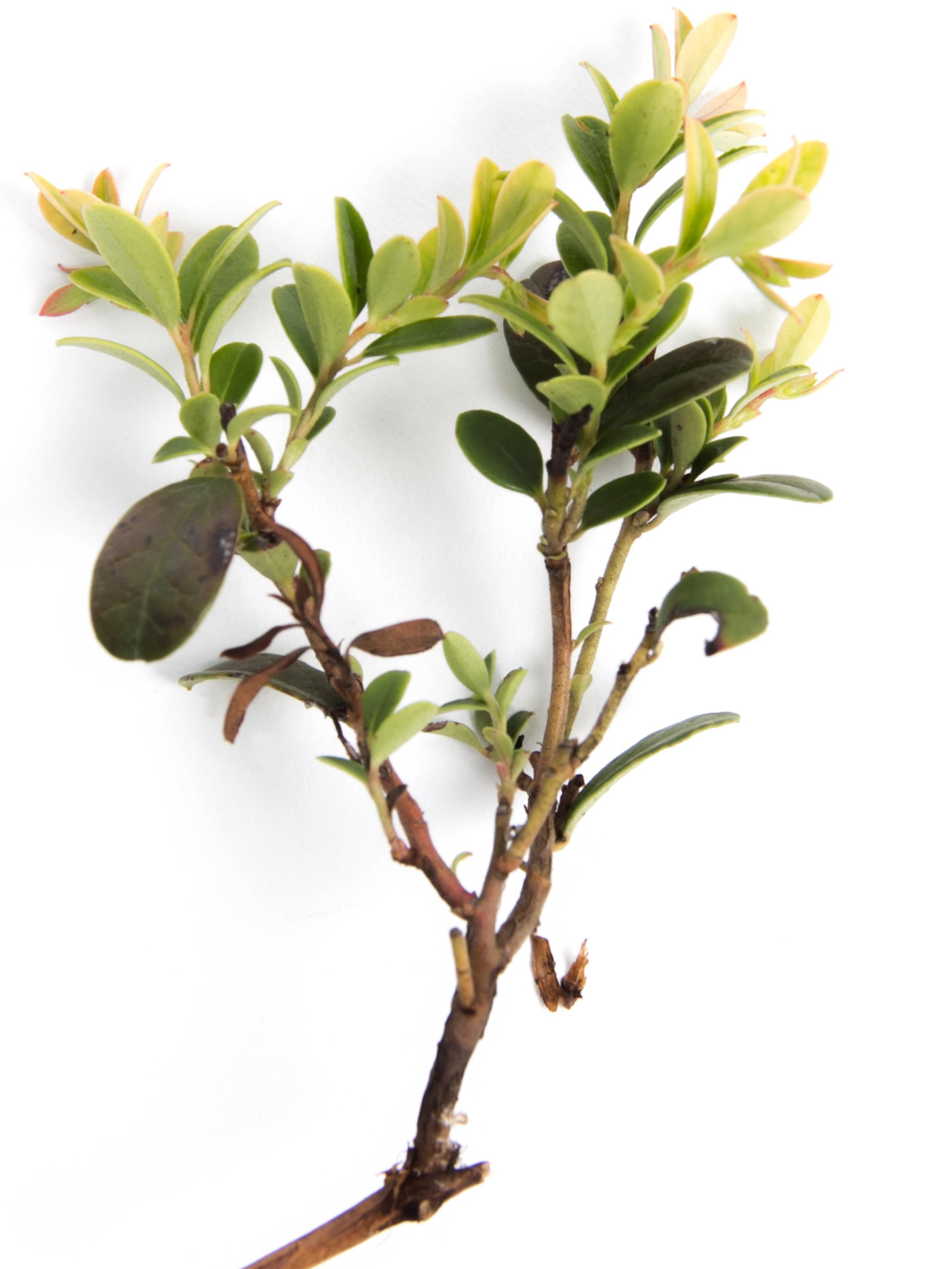 Description: Plusieurs feuilles terminales d'un plant d’airelle rouge présentent un jaunissement et/ou une coloration rosée des tissus. Une brûlure des tiges secondaire est aussi observable. Ces symptômes sont attribuables à une dérive de glyphosate. Les plus jeunes feuilles sont les premières à être affectées. Les symptômes apparaissent dans un délai de 10 à 14 jours, suivant l'application. Le dosage chimique a révélé la présence de résidus de glyphosate dans la plante à une concentration faible mais suffisante pour provoquer les symptômes observés.