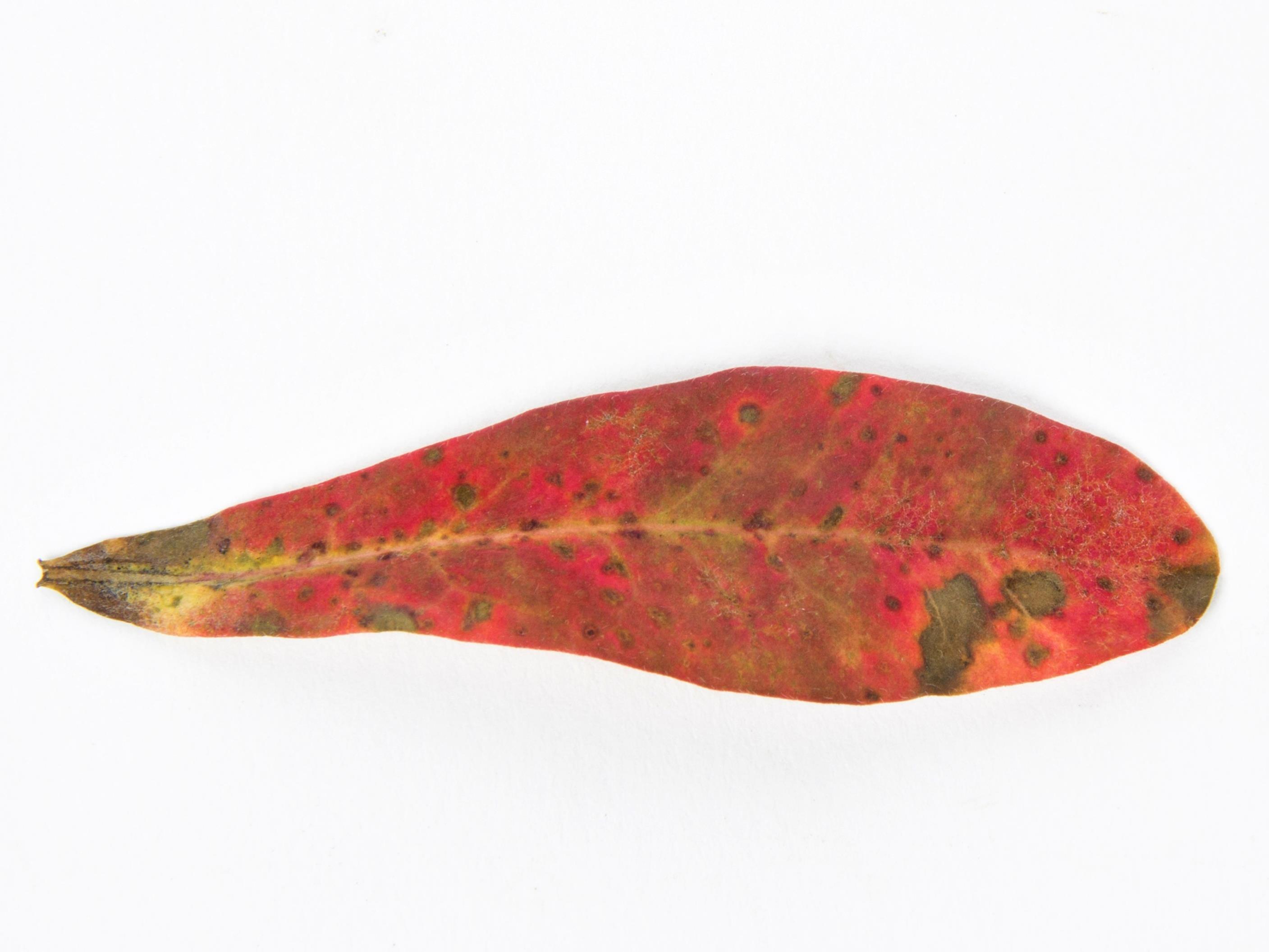 Description: Une feuille d’un plant d’euphorbe montre des taches brunes circulaires, avec un halo plus pâle, dispersées aléatoirement sur le limbe. Celles-ci traversent le limbe, sont sèches et confluent en certains endroits. Le plant est presque complètement défolié. La coloration rosée de la feuille serait plutôt associée à la présence de Podosphaera sp., un champignon phytopathogène qui affecte l’échantillon. Dans la pépinière, environ 95% des plants montrent ces dommages qui sont apparus soudainement. Le dosage chimique de l’échantillon a révélé une concentration très élevée d’indaziflam (Alion), un herbicide appliqué dans la pépinière. D’autres matières actives ont également été retrouvées, dont le spirotétramate (Movento), un insecticide : ces autres produits ne seraient pas en lien avec les symptômes observés. Une surdose de l’herbicide indaziflam peut expliquer la présence des nombreuses taches observées sur les feuilles.