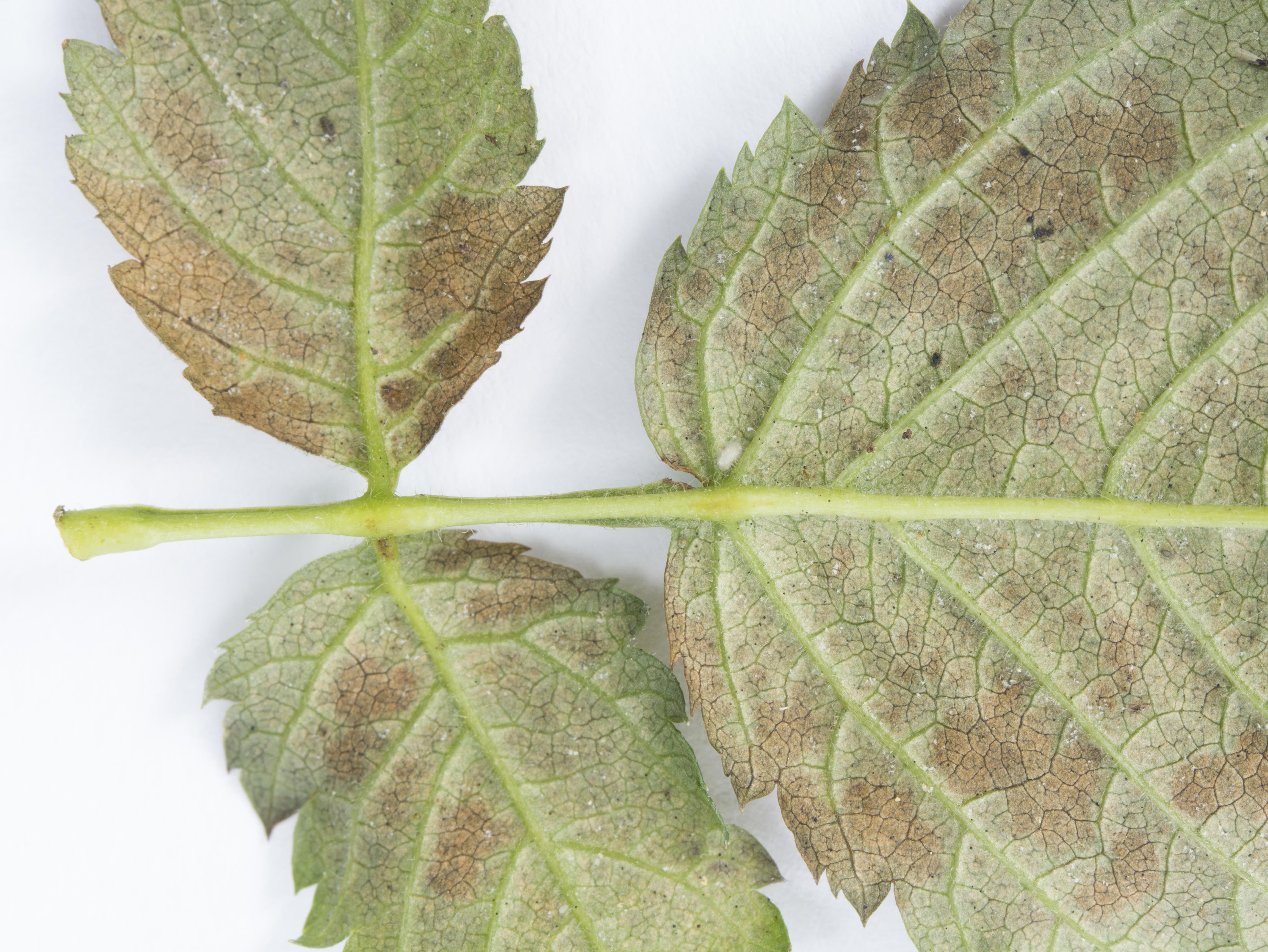 Description: La face inférieure d’une feuille d'Aruncus dioicus (Barbe-de-bouc) présente un aspect de bronzage/brunissement, localisé entre les nervures. Ce symptôme est davantage apparent à la face supérieure. De petites taches ressemblant à des mouchetures sur les feuilles sont aussi apparentes mais sont reliées à des dommages d’alimentation causés par le tétranyque à deux points, Tetranychus urticae. Ce dernier se nourrit du contenu des cellules végétales, ce qui peut nuire à l'activité photosynthétique de son hôte. Dans la pépinière, environ 95% des plants montrent des symptômes de bronzage/brunissement ou, à un stade plus avancé, de brûlures sur les feuilles. Ces dommages sont apparus soudainement. Le dosage chimique de l’échantillon a révélé une concentration très élevée d’indaziflam (Alion), un herbicide appliqué dans la pépinière. D’autres matières actives ont également été retrouvées, dont le spirotétramate (Movento), un insecticide : ces autres produits ne seraient pas en lien avec les symptômes observés. Une surdose de l’herbicide indaziflam peut expliquer l’effet de bronzage ou les brûlures observés sur les feuilles.
