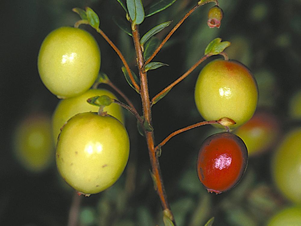 Description: Une canneberge (en bas à droite) présentant un mûrissement prématuré causé par la pyrale des atocas. La femelle pond ses oeufs individuellement sous les lobes du fruit. La jeune larve perce un trou, pénètre dans le fruit et ferme le trou avec de la soie. Plus âgée, elle laisse le trou béant, y rejetant souvent des excréments. Les larves se développent principalement dans les fruits verts et s'alimentent presque de la totalité du fruit. Les fruits attaqués mûrissent prématurément. Une larve peut consommer de trois à six fruits pendant son développement larvaire. À maturité, elle se laisse tomber au sol alors que les fruits endommagés se ratatinent et peuvent rester accrochés au pédoncule jusqu'au printemps suivant.