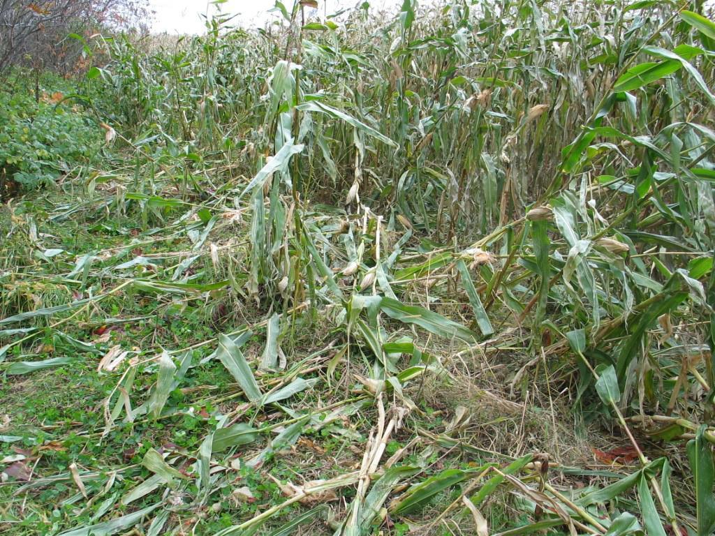 : Les plants en bordure d’un champ de maïs grain et fourrager sont cassés ou couchés au sol. Ce dommage est caractéristique et causé par les ratons laveurs.