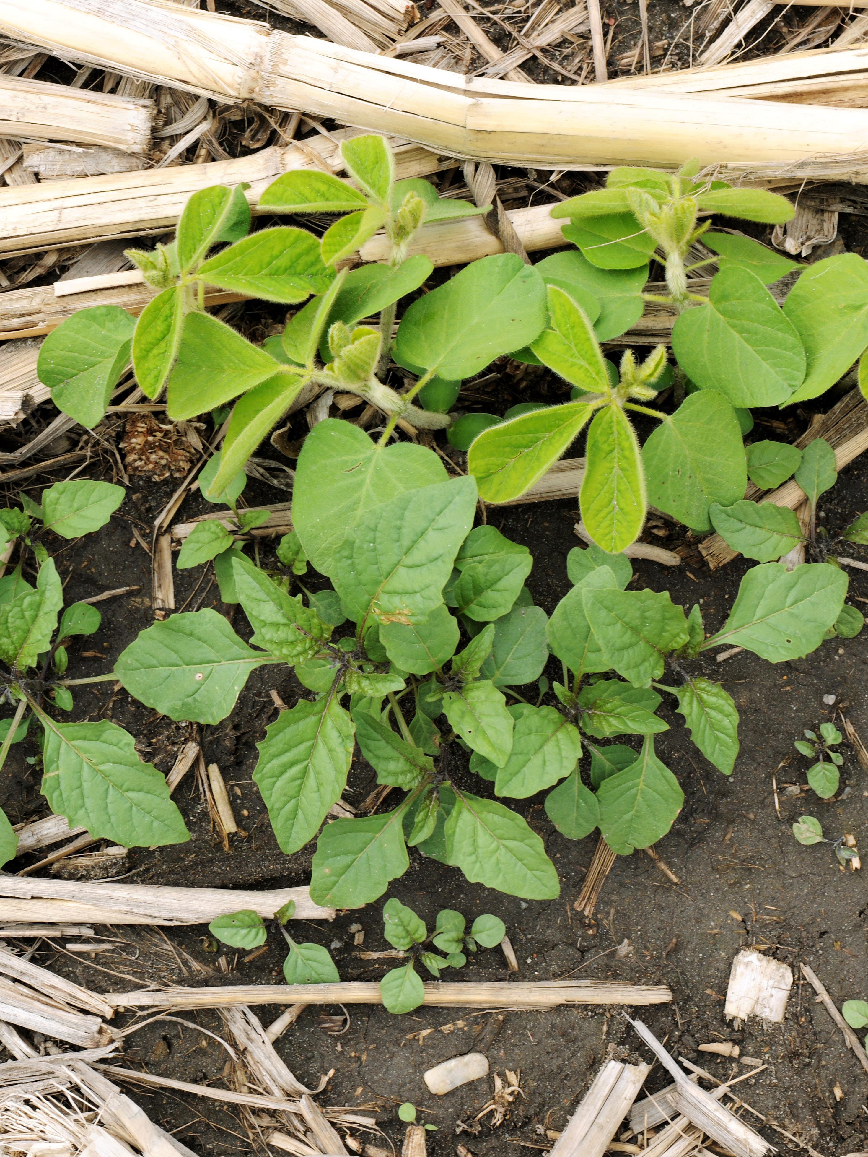 : Plantules à différents stades, entre les rangs de soya en semis direct