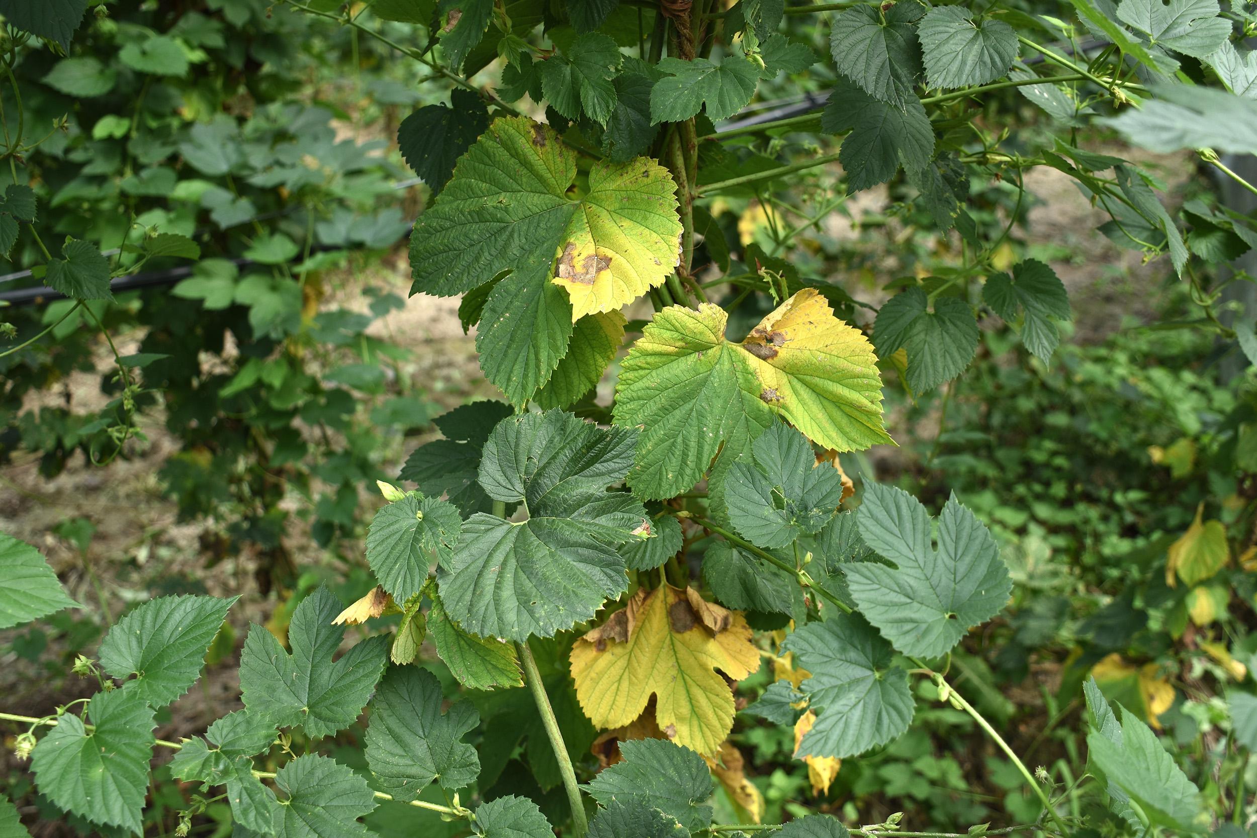 Légende: Lésions causées par la brûlure à halo et chlorose sur des feuilles matures.
