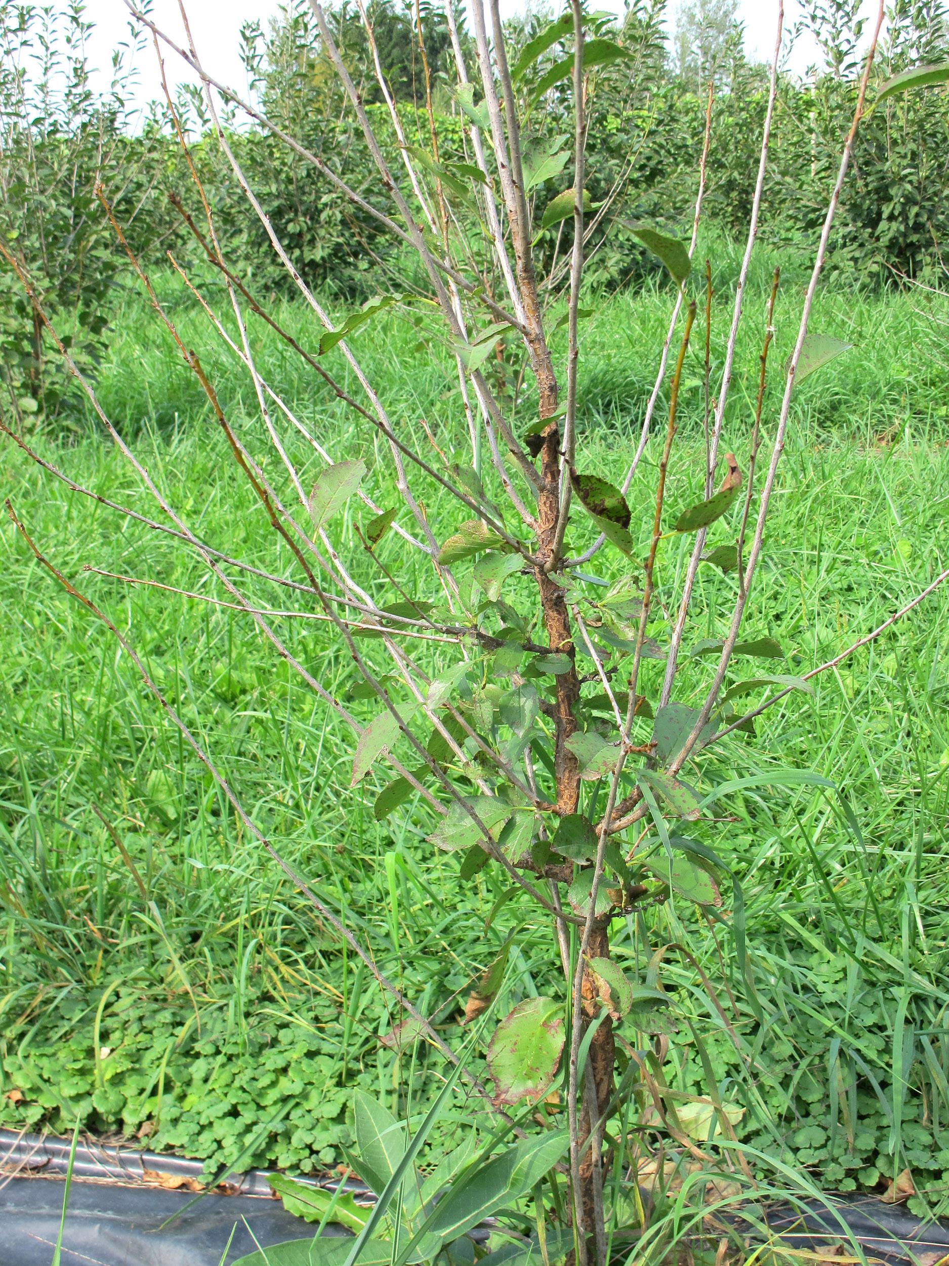 : Défoliation hâtive d’un jeune plant de cerisier nain rustique Romeo en septembre.