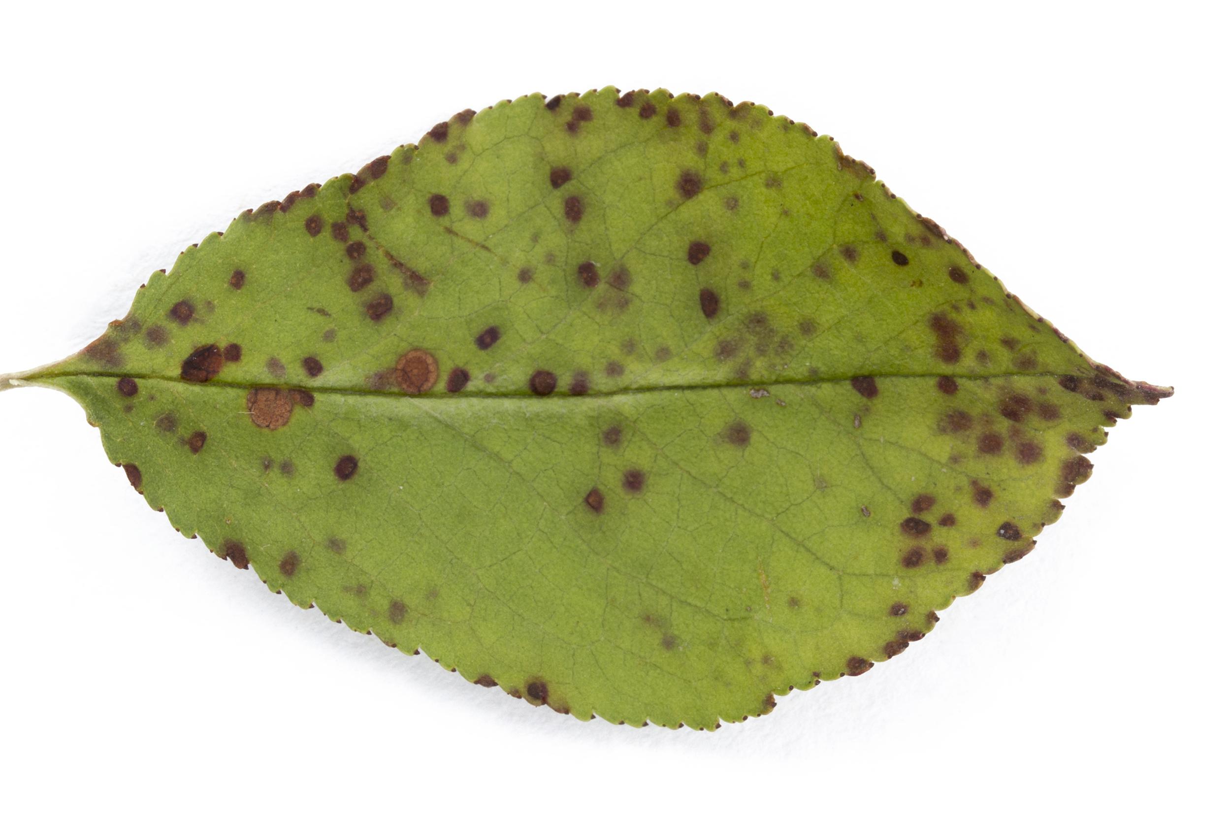 Description: De nombreuses petites taches circulaires d’environ 3 mm et de couleur brun pourpre se sont développées sur la face supérieure de cette feuille de cerisier nain rustique, à la suite d'une infection par Blumeriella jaapii. Des fructifications fongiques se développent au revers de ces taches.