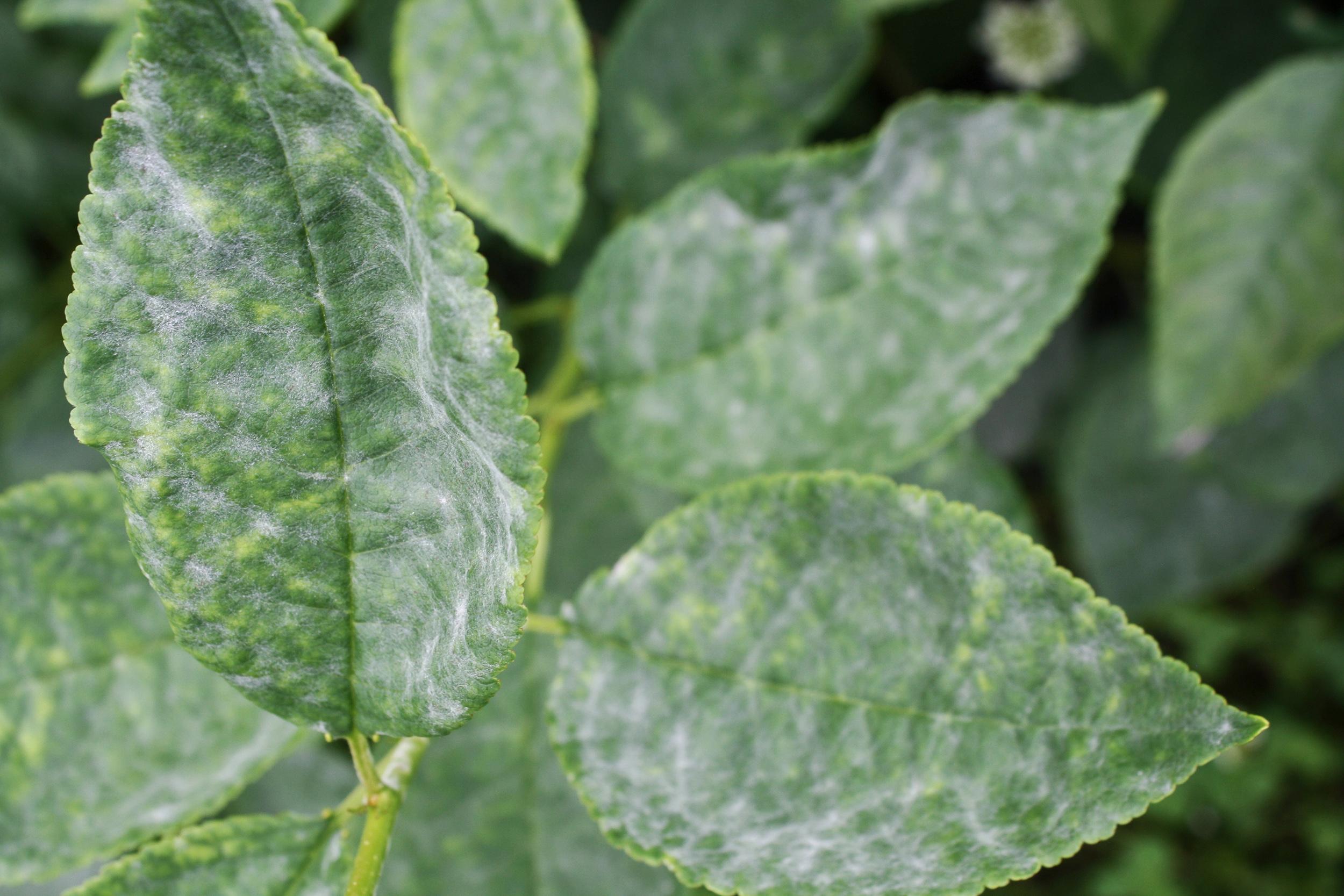 Description: Le duvet poudreux blanc sur les feuilles de ce cerisier nain rustique correspond au mycélium et aux conidies du champignon Podosphaera clandestina, responsable de la maladie du blanc.