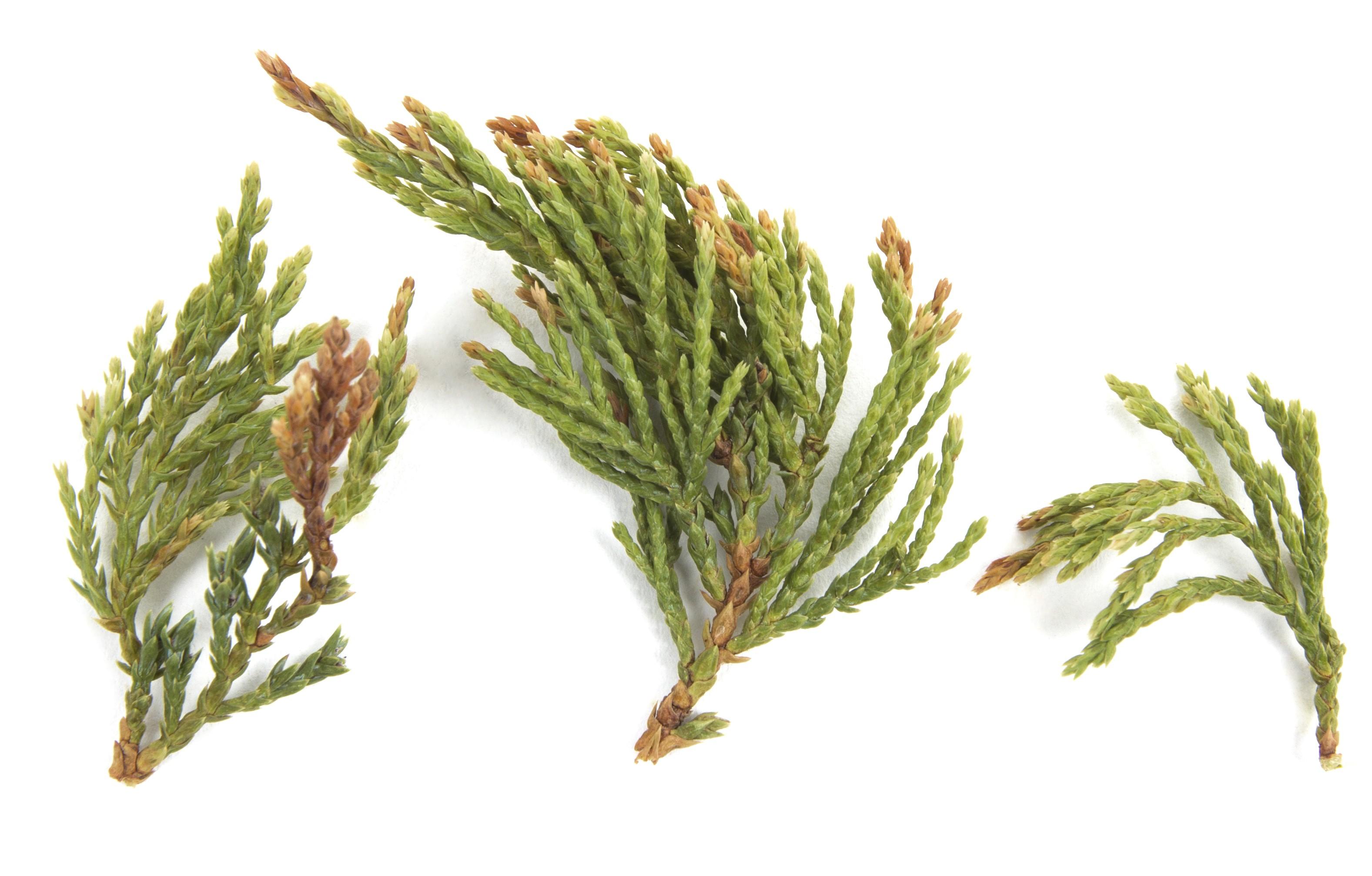Description: Les pousses terminales d’un genévrier montrent des brûlures à l’apex. Toutes les tiges et feuilles terminales de l’arbre montrent une brûlure (ou dessèchement) de dimension variable et un dépérissement notable. Quelques feuilles terminales montrent des zones sèches et brunies (non visible sur l’image). Ces symptômes sont apparus graduellement. Un dosage chimique a permis de déceler la présence de glyphosate ainsi que de son métabolite de dégradation, l’AMPA (acide aminométhylphosphonique), en concentration suffisante pour provoquer les symptômes observés. Le glyphosate est un herbicide de contact et systémique qui s’accumule dans les méristèmes apicaux des végétaux; les dommages observés sont typiques d’une phytotoxicité causée par ce produit. Une pulvérisation, effectuée par erreur et à proximité du tronc, serait à l’origine des dommages observés.