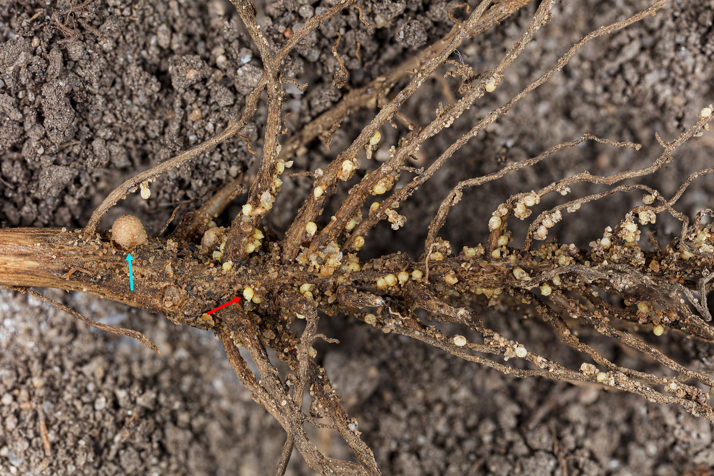 Description: Sur cette photo, on remarque les nombreux kystes du nématode Heterodera glycines, qui parasitent le système racinaire d'un plant de soya (flèche rouge). On les identifie par leur couleur blanche à jaunâtre, leur forme ovoïde et acuminée et leur taille d'environ 1 mm, soit presque 10 fois plus petit que les nodules symbiotiques fixateurs d'azote (flèche bleue). Les femelles sont sédentarisées dans leur site d'alimentation et sont remplies d'œufs ou de larves. Elles se nourrissent des liquides cellulaires, ce qui affaiblit significativement les racines.