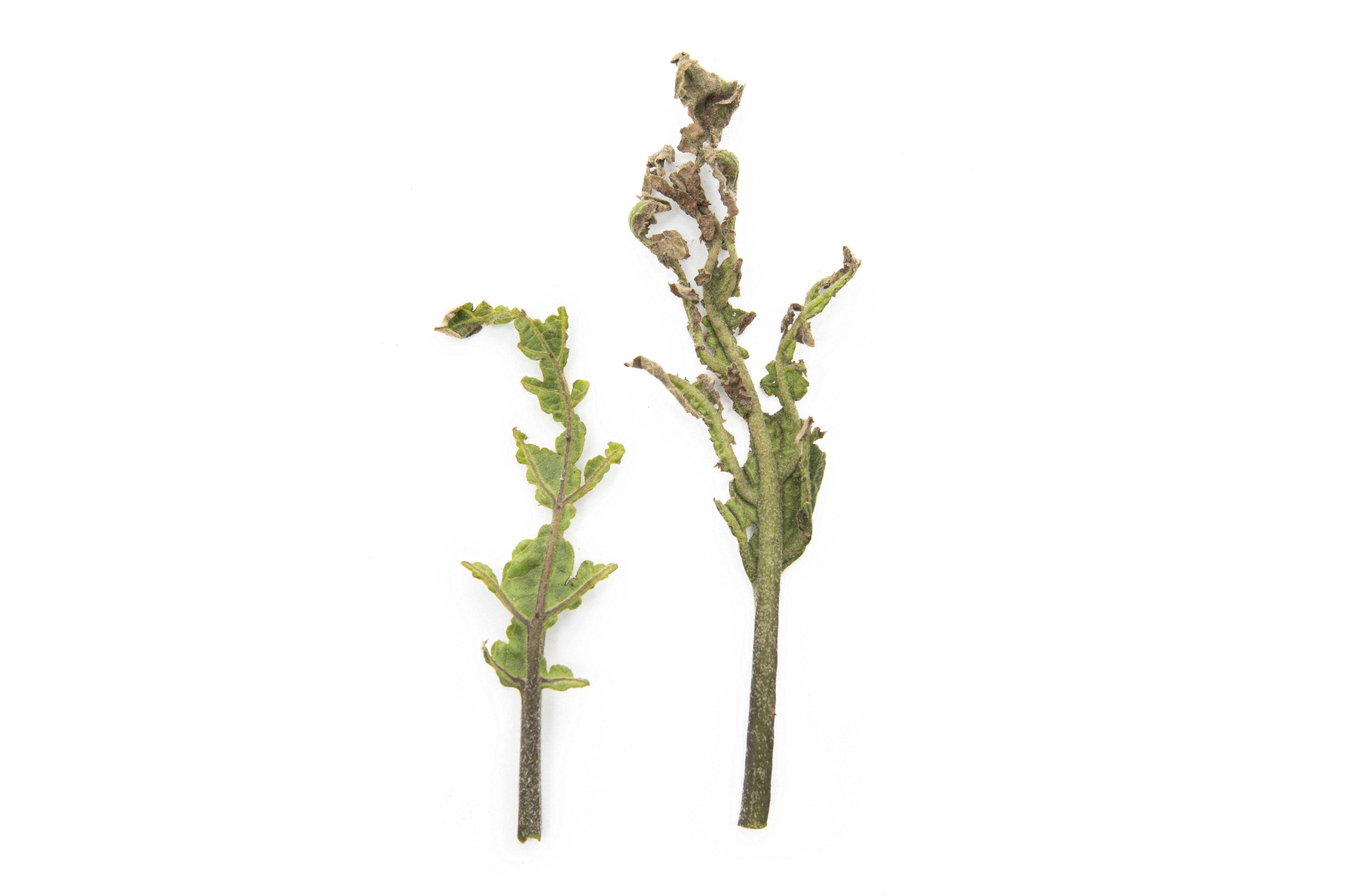 Description: Les feuilles terminales d’un plant d’aubergine (Solanum melongena) présentent des brûlures sur la presque totalité du limbe, confluentes en plusieurs endroits de sorte que les plages brûlées ont laissé place à des trous (aspect grignoté). Les tissus du limbe ont un aspect gaufré; la texture et la forme en sont altérées. Le DUAL II MAGNUM (S-métolachlore) peut provoquer des dommages aux cultures chez lesquelles il est homologué, qui débutent par un jaunissement internervaire, suivi d’un brunissement et la nécrose des tissus. Certains cultivars sont plus sensibles que d’autres. Le dosage chimique réalisé a détecté une concentration assez élevée de l’herbicide dans les tissus de l’aubergine. Par ailleurs, aucun des virus testés n'a été détecté dans les feuilles de cet échantillon. Les conditions fraîches et humides pourraient avoir contribué à ralentir la métabolisation du produit dans la plante et exacerber les symptômes sur celle-ci.