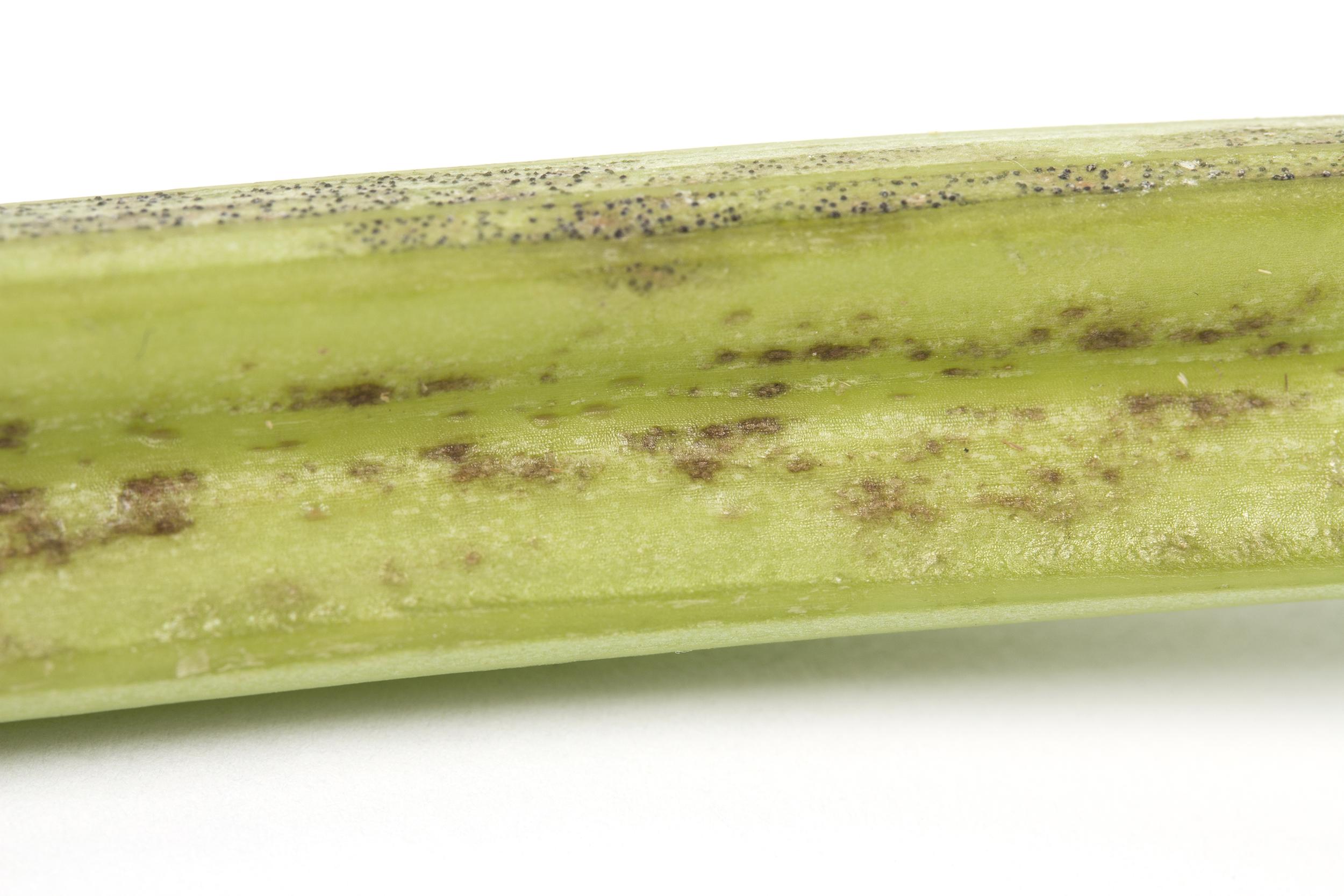 Description: Les pétioles de céleri montrent des taches beiges à brunes de forme allongées. Les taches portent parfois de minuscules ponctuations noires, qui correspondent aux pycnides de Septoria apiicola, responsable de la tache septorienne du céleri.