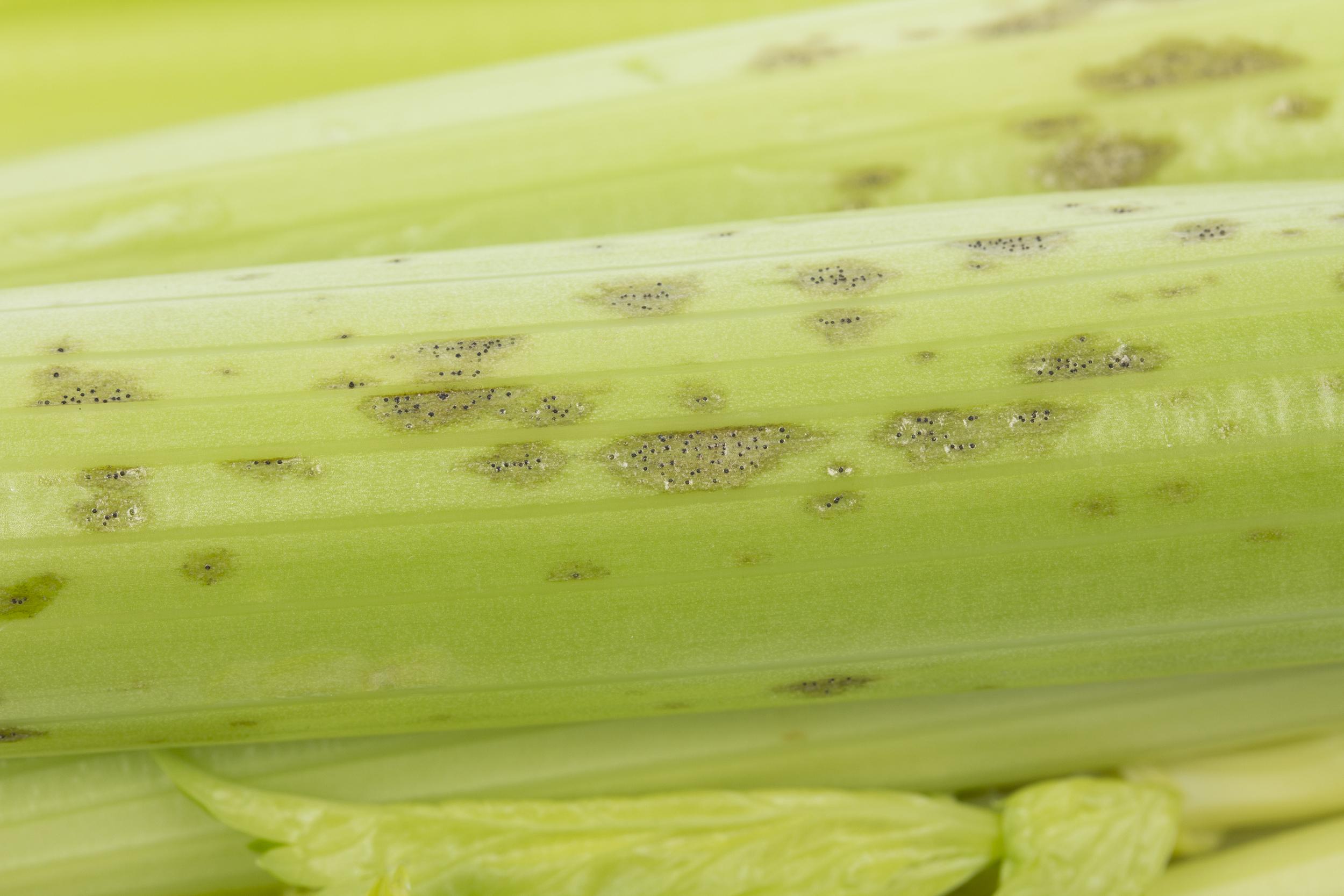 Description: Les pétioles de céleri montrent des taches beiges à brunes de forme allongées. Les taches portent de minuscules ponctuations noires, qui correspondent aux pycnides de Septoria apiicola, responsable de la tache septorienne du céleri.