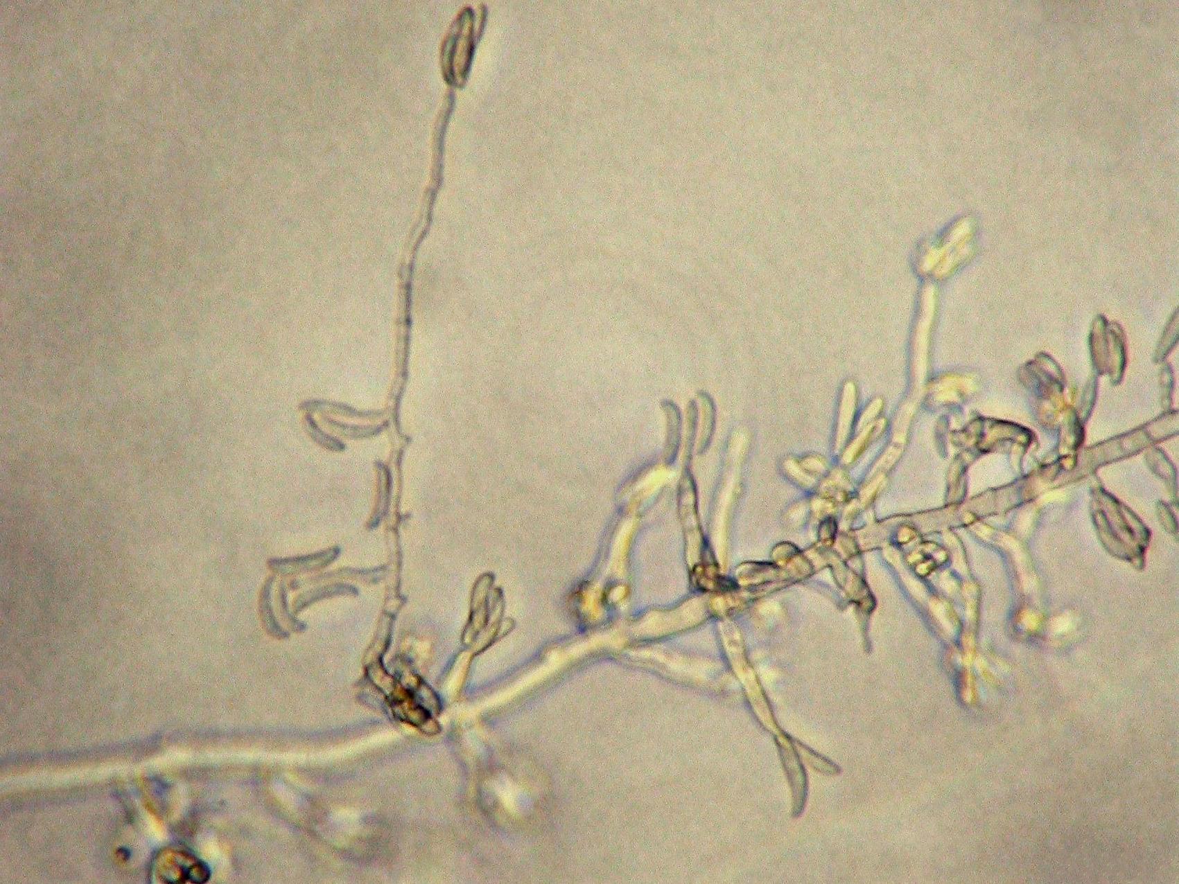 : Microconidies de Fusarium oxysporum en "fausse tête", sur monophialide solitaire