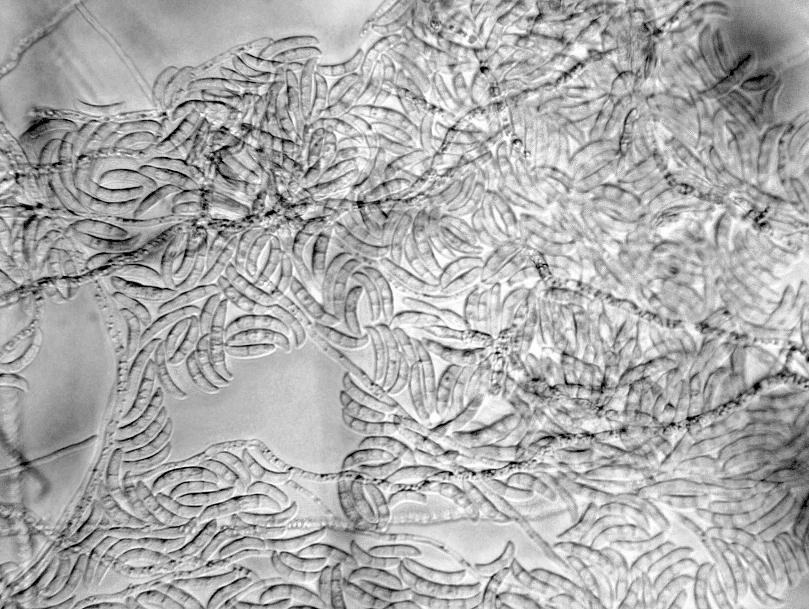 Légende: Conidies (macroconidies) et hyphes de Fusarium sp.