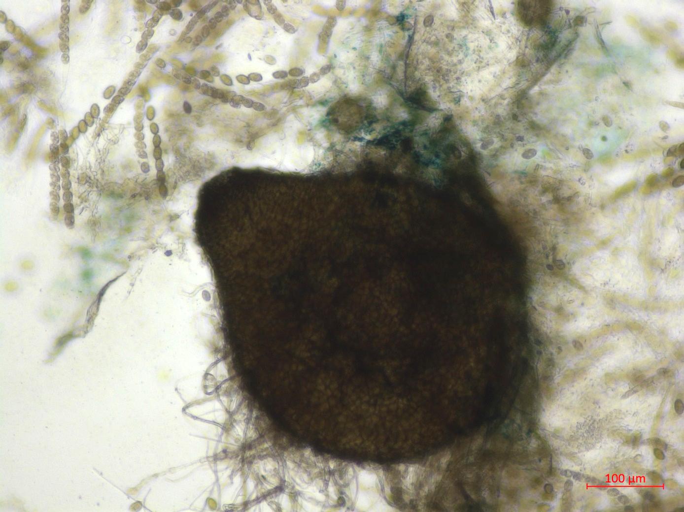 : Périthèce de Sordaria sp. et quelques ascospores contenues dans leur asque