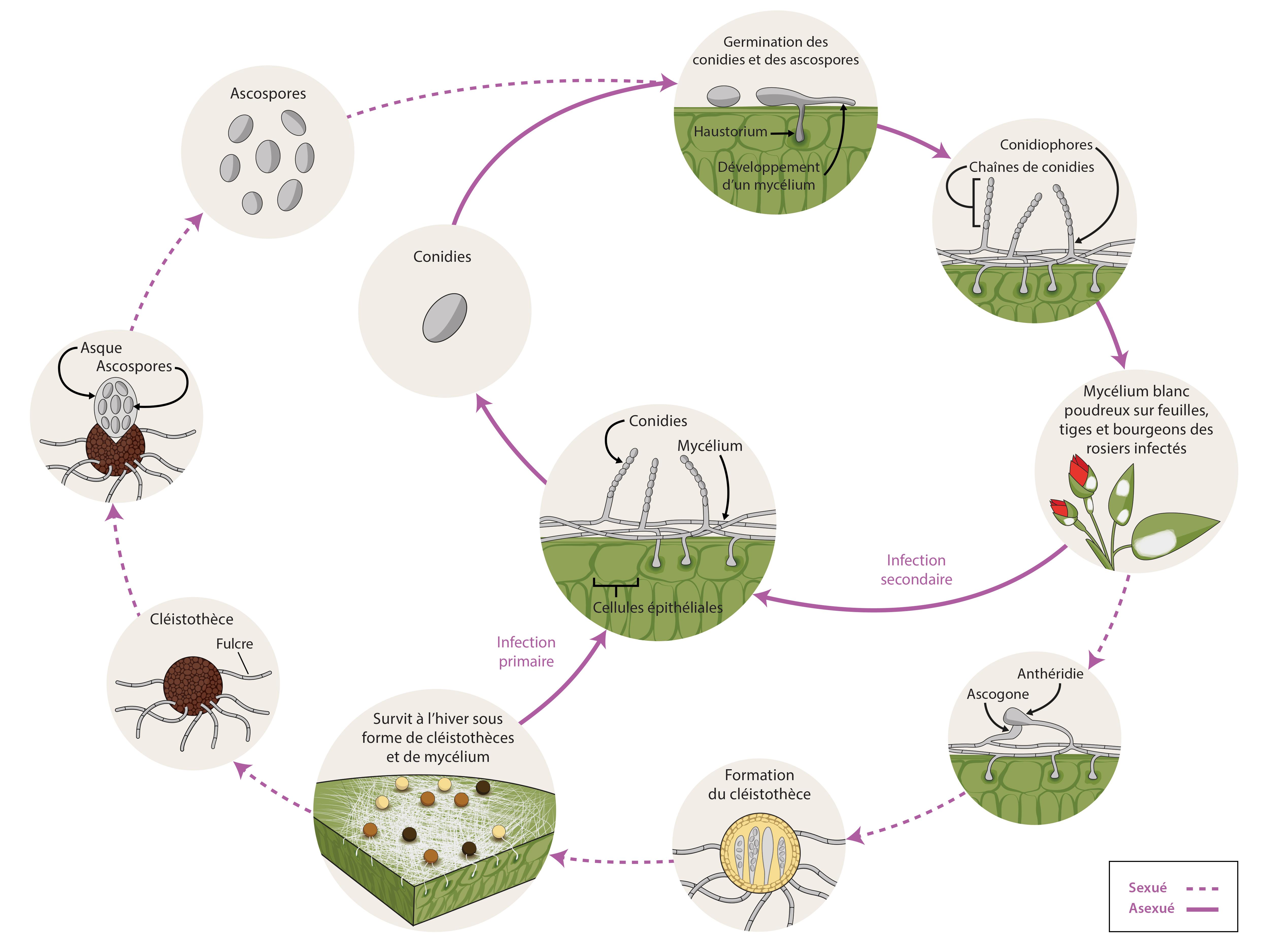 : Cycle épidémiologique de Podosphaera panmosa, responsable du blanc chez le rosier.