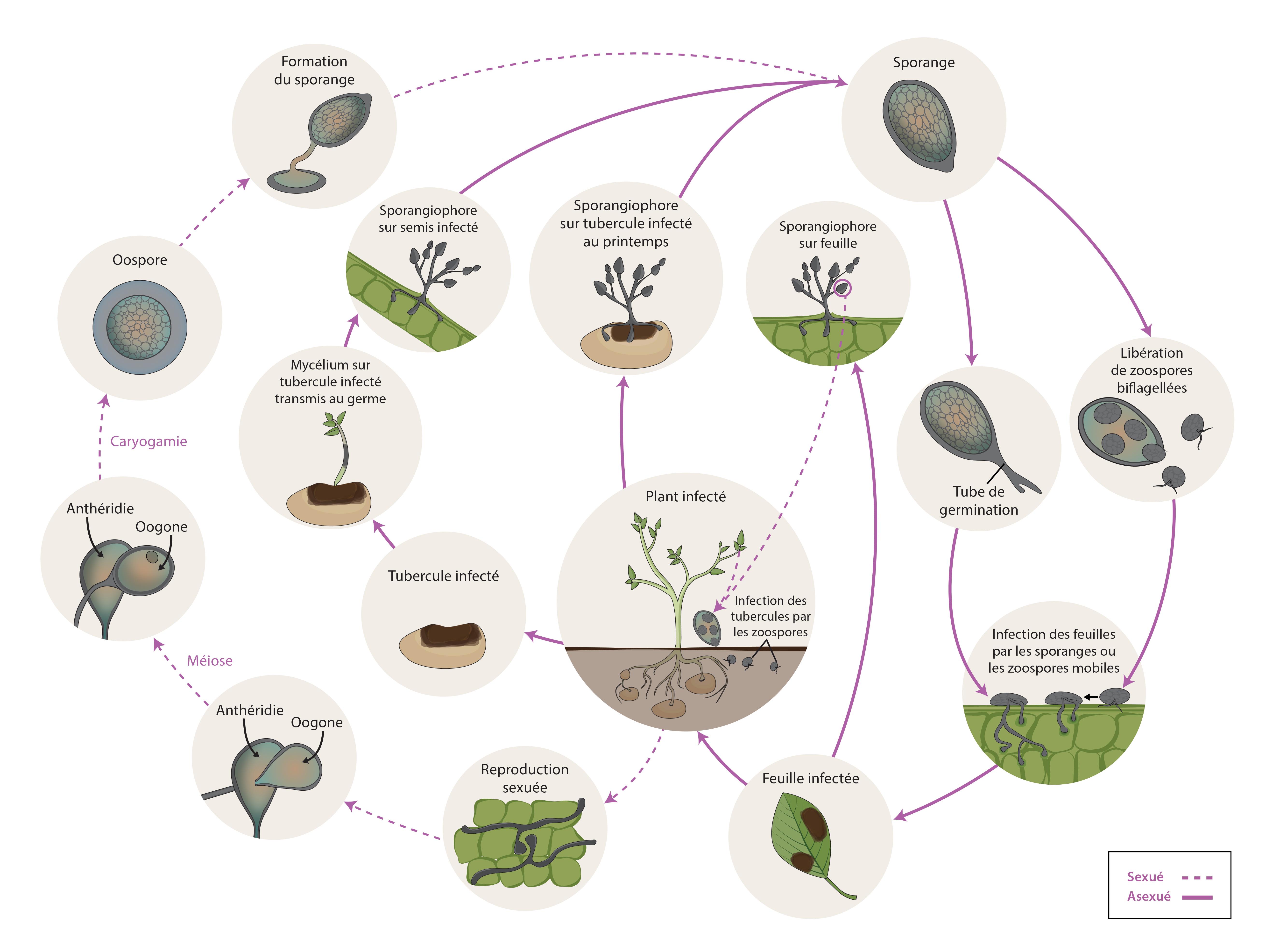 : Cycle épidémiologique du mildiou de la pomme de terre causé par Phytophthora infestans.