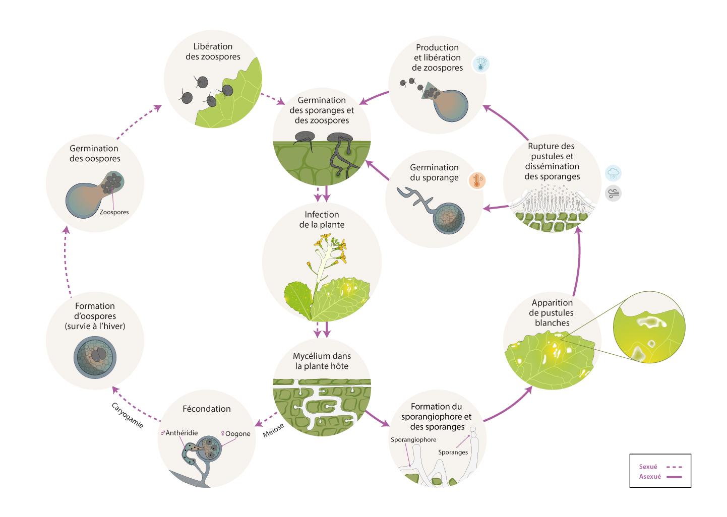 : Cycle épidémiologique de Albugo candida, responsable de la rouille blanche des crucifères.