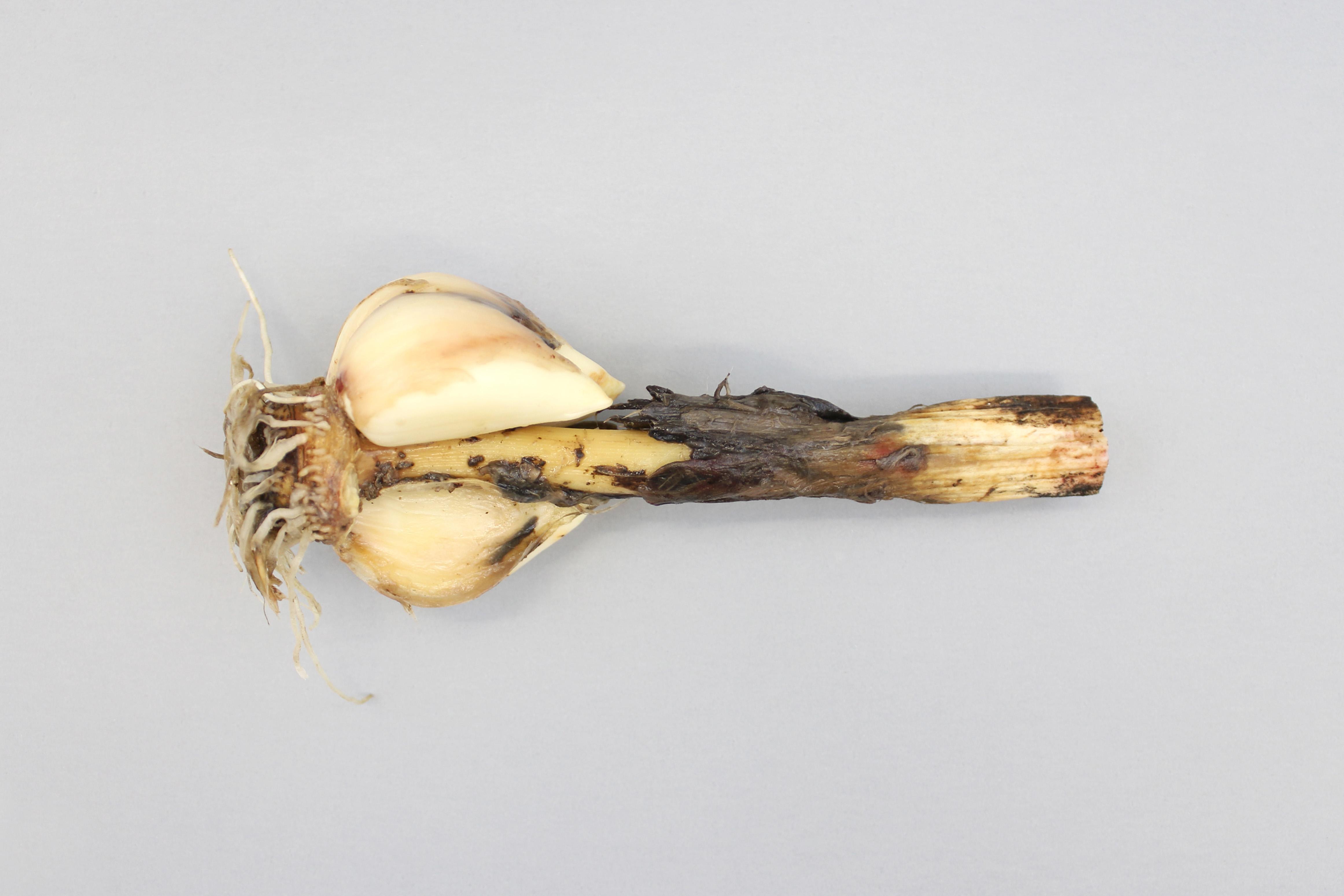 Description: Sur ce bulbe d’ail provenant d‘un champ, les tuniques externes et les tissus du collet sont pourris et couverts d’une fine couche de fructifications noires poudreuses et des setae. Les tests de laboratoire ont révélé la présence du champignon Colletotrichum circinans, responsable de l’anthracnose chez les Allium. Les symptômes sont apparus lors de la maturation des gousses.