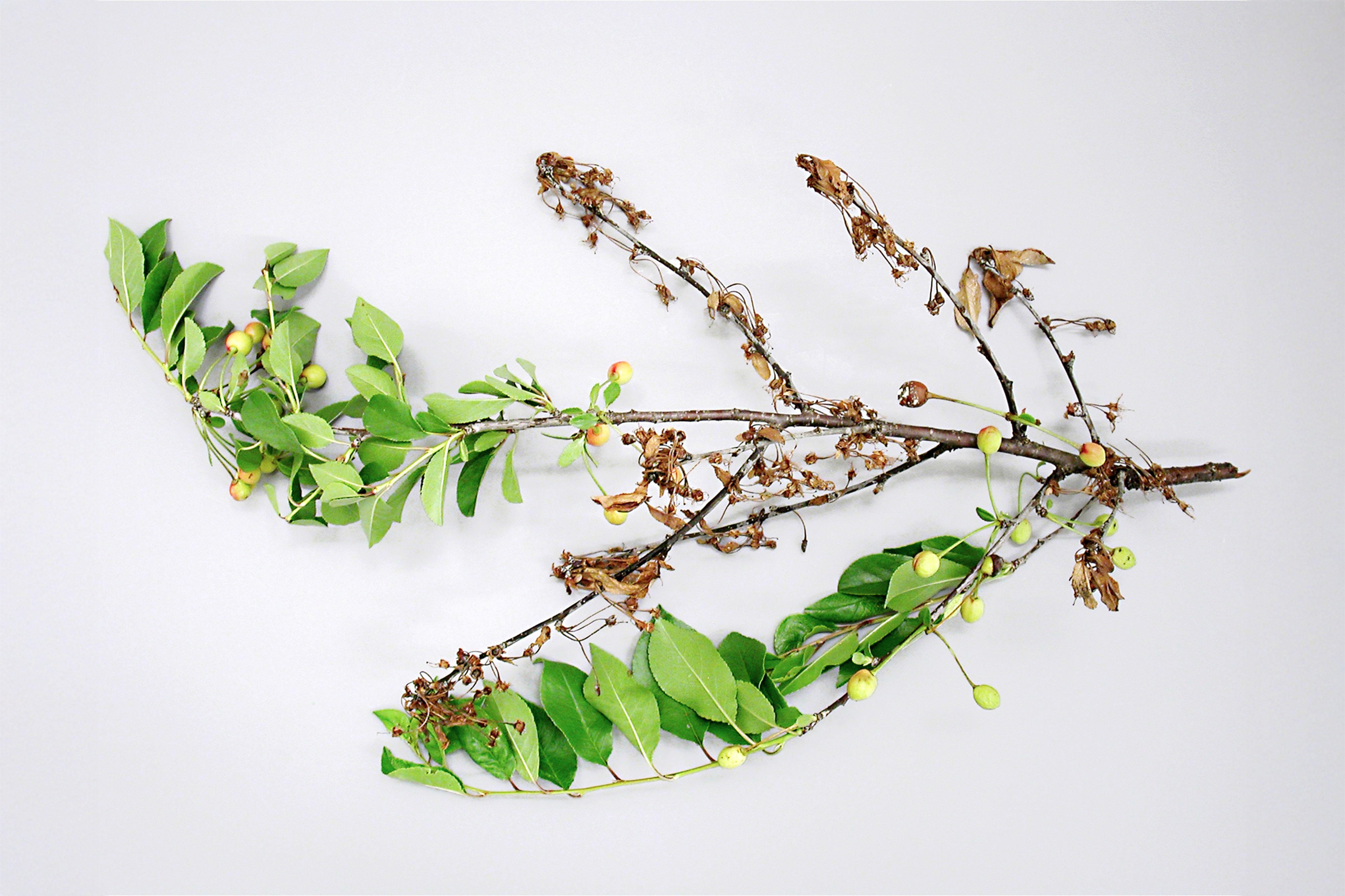 Plusieurs tiges de ce cerisier nain rustique sont infectées par la pourriture brune. Les fleurs et les feuilles infectées sont brunies et séchées. Les fruits sont pourris et se momifient.