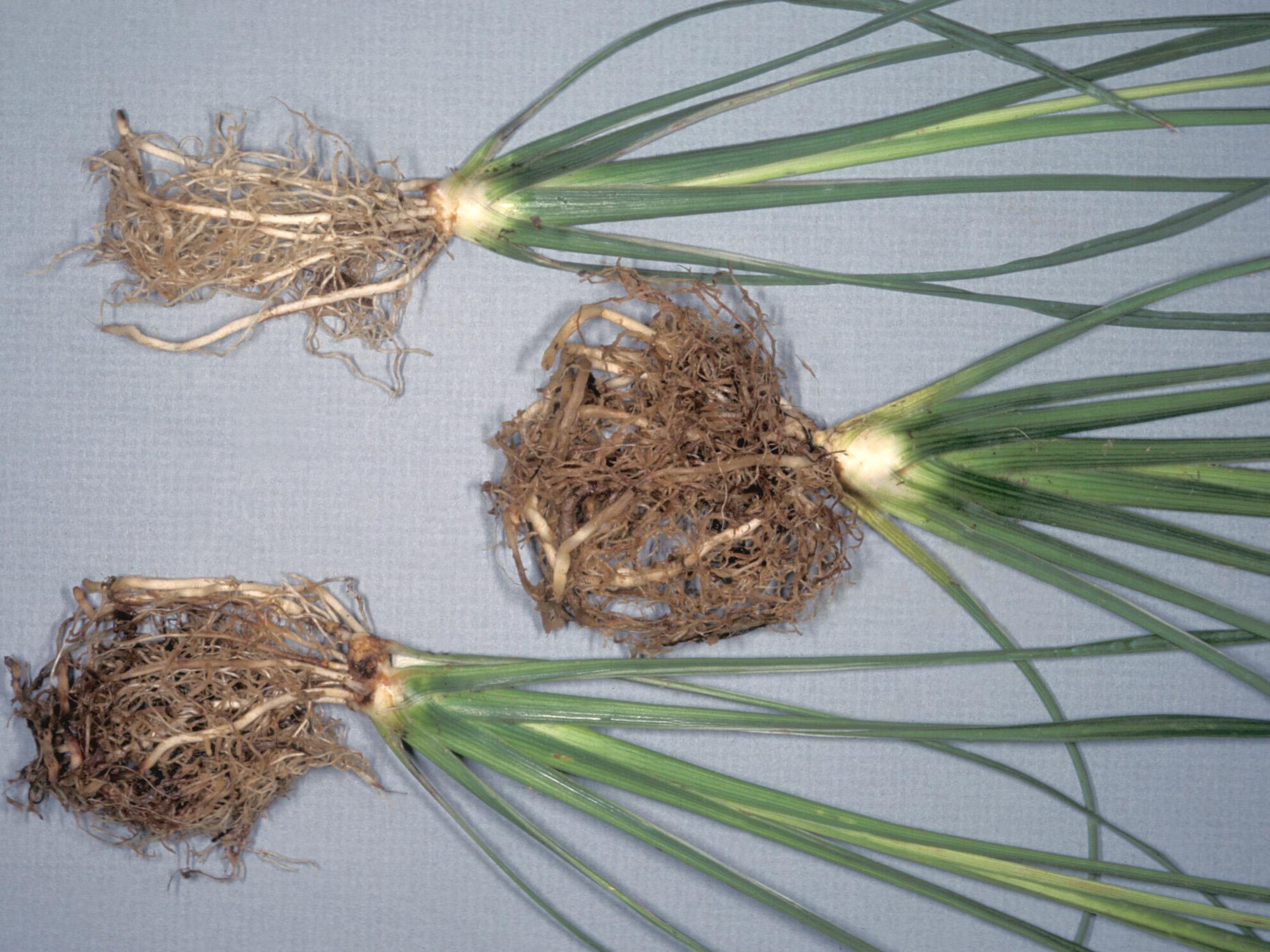 Description: Sur des plants de dracénas cultivés en serre, présence d’un système racinaire constitué de racines brunes et pourries dont le cortex se détache facilement de la stèle (plants à droite et au centre). Le plant à gauche est sans symptôme. Les tests de laboratoire ont révélé la présence du champignon Fusarium oxysporum, responsable de la pourriture fusarienne.