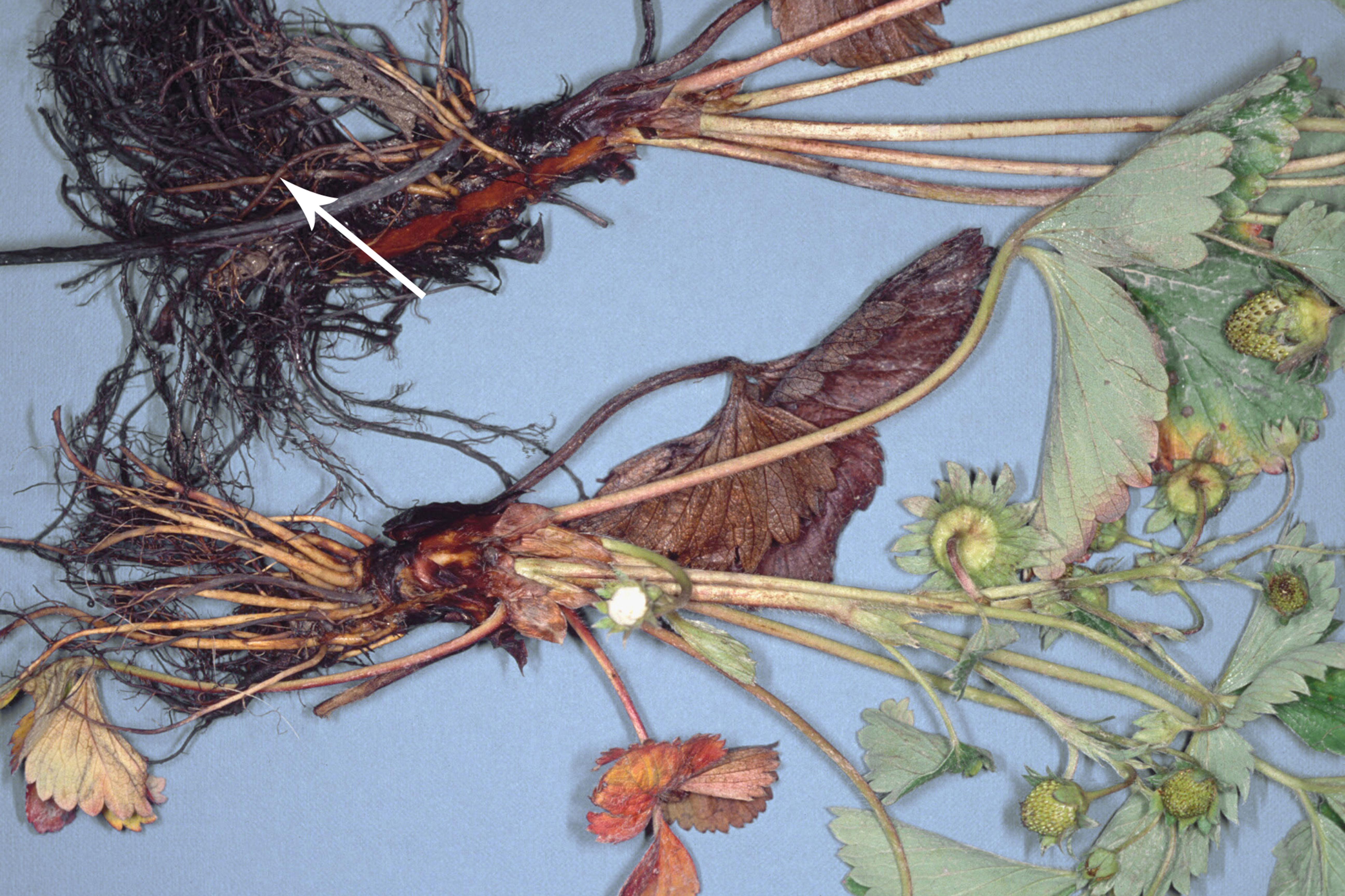 Légende: Comparaison entre un système racinaire de fraisier sain et affecté