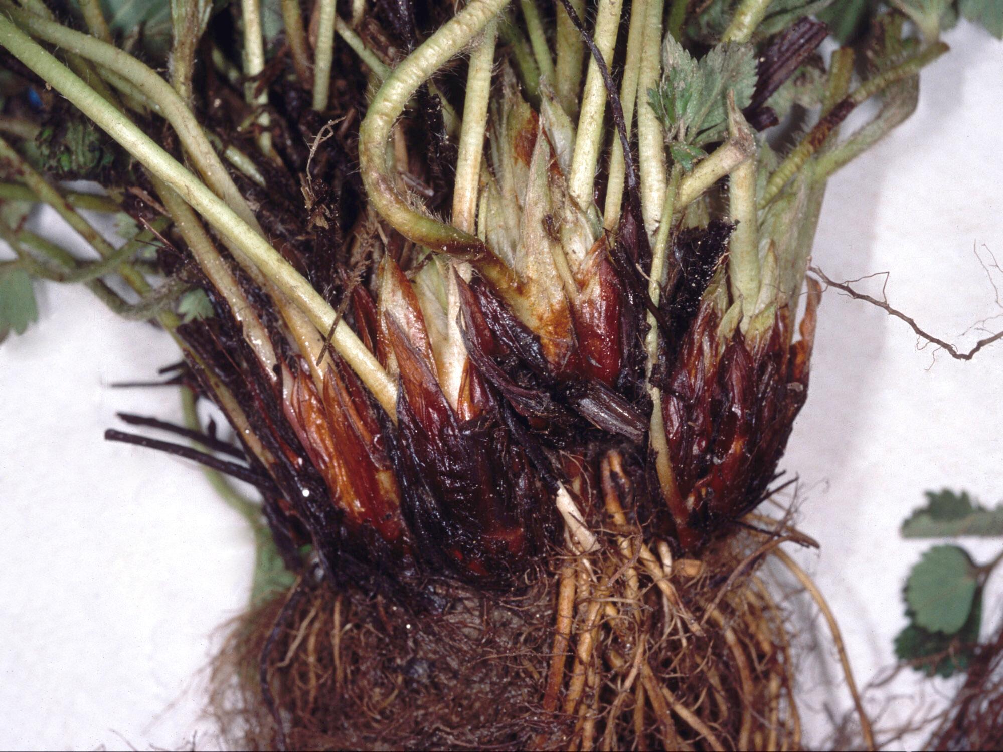 Description: Le fraisier (cv 'Jewel') présente une importante malformation qui se caractérise par la présence de multiples collets accolés les uns sur les autres. Les feuilles sont nombreuses et petites (peu visible ici). Ces symptômes sont caractéristiques de la maladie des collets multiples causée par un phytoplasme.