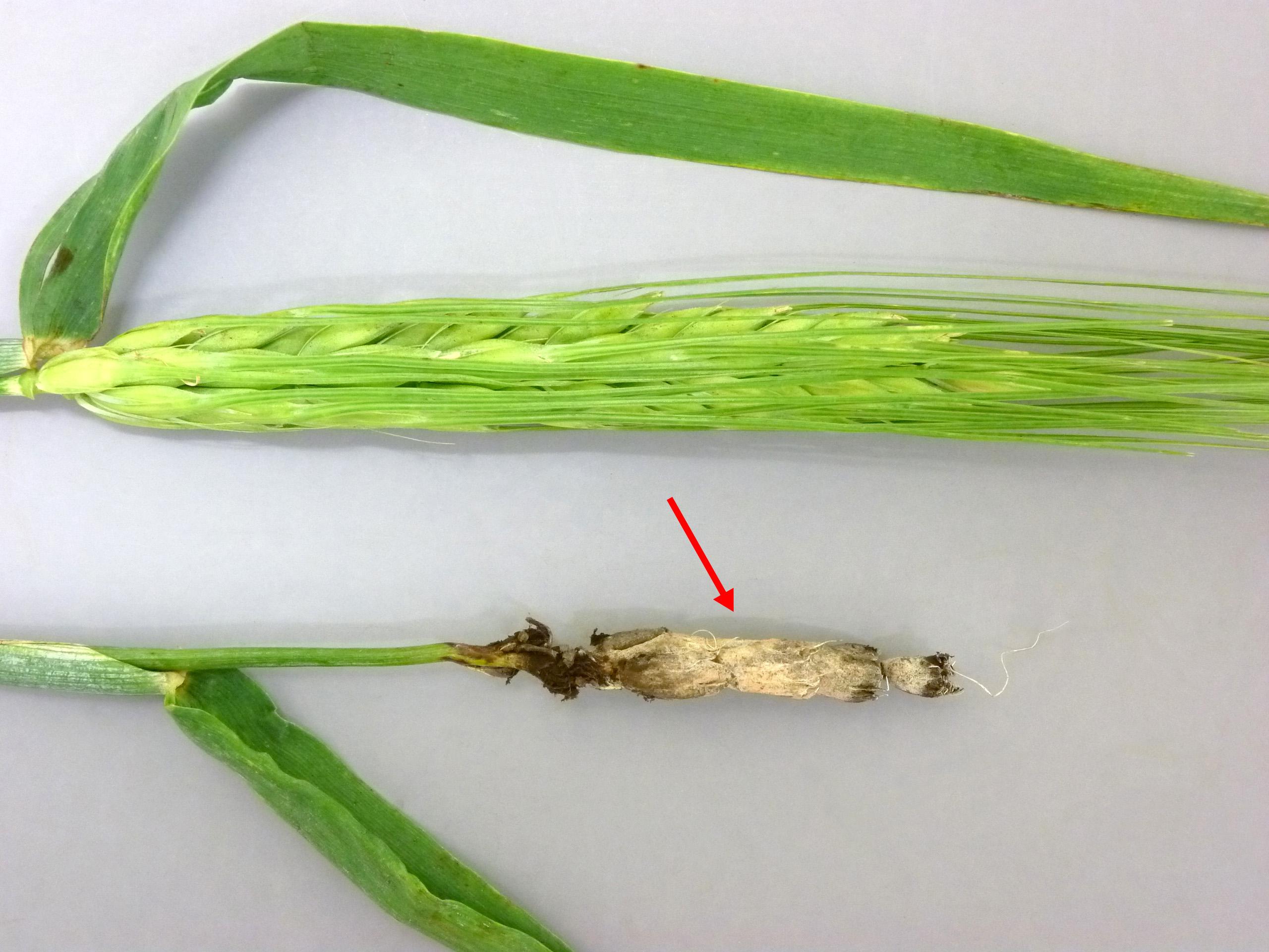 Description: Comparaison entre un épi d’orge sans symptôme et un épi affecté (cv 'Cyane'). L’épi affecté est moins bien développé et plus court. Les grains sont détruits et remplacés par des masses de spores brun grisâtre qui sont couvertes d’une membrane (voir flèche) sauf dans la partie basale où les spores sont dénudées. Les observations microscopiques ont révélé la présence de téliospores caractéristiques du champignon Ustilago hordei, responsable du charbon vêtu.