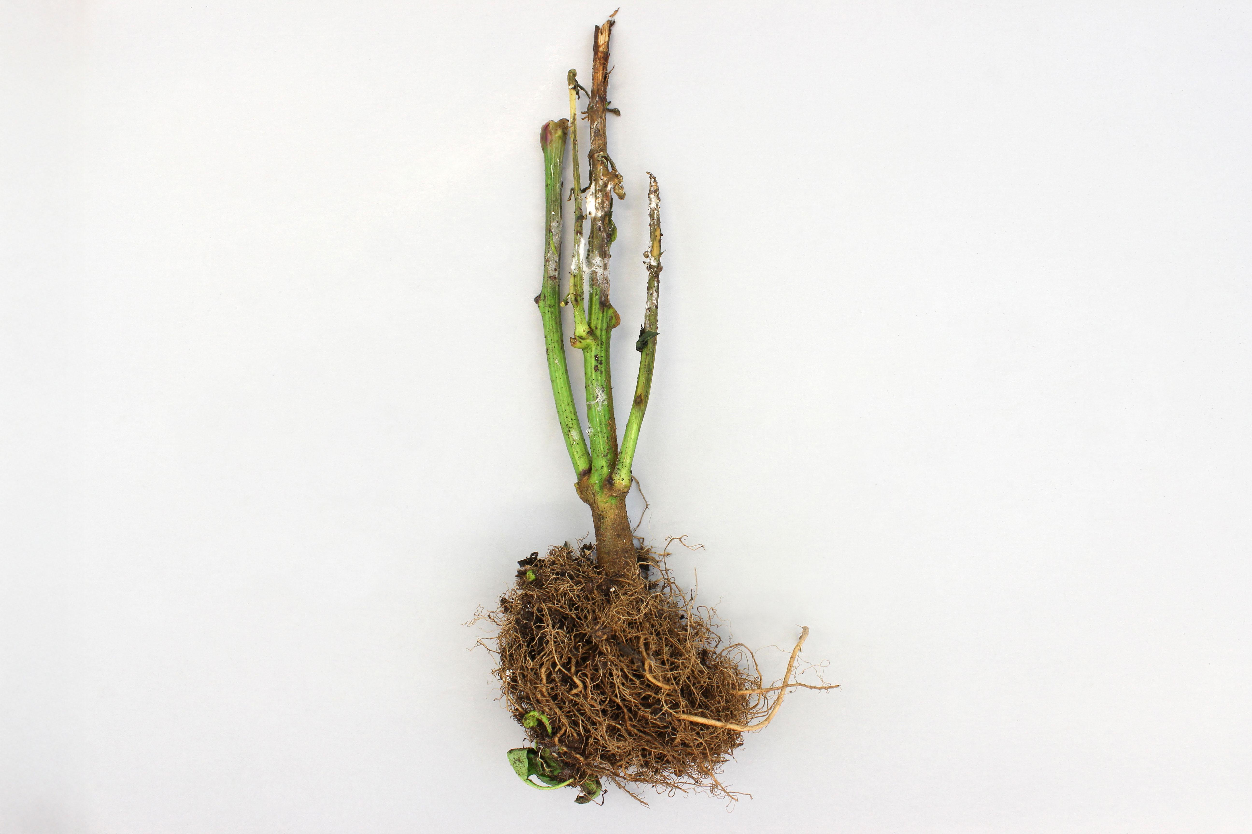 Légende: Pourriture et mycélium blanc sur tiges de poivron