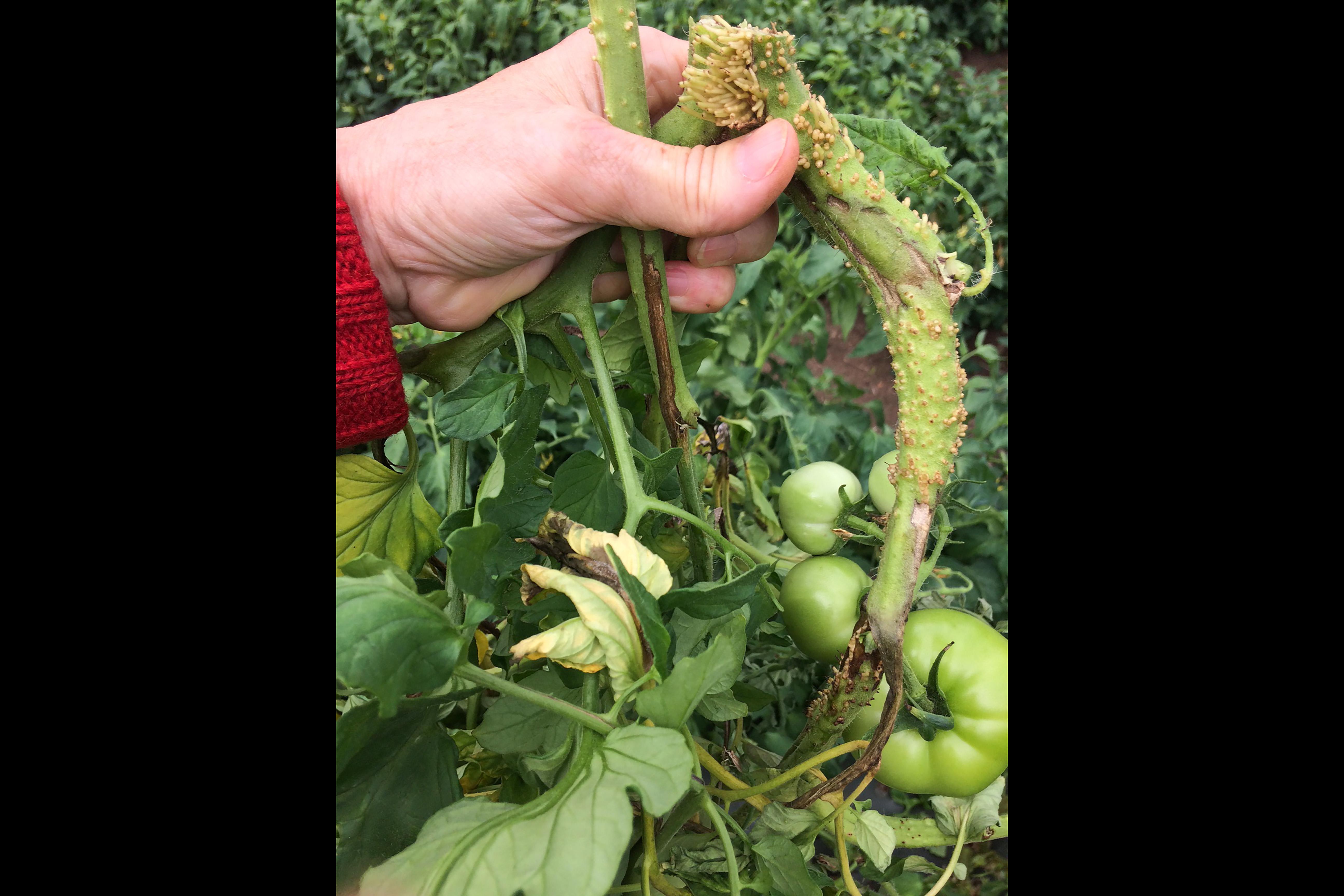 Légende: Chancres bruns et primordia de racines sur tiges de tomate