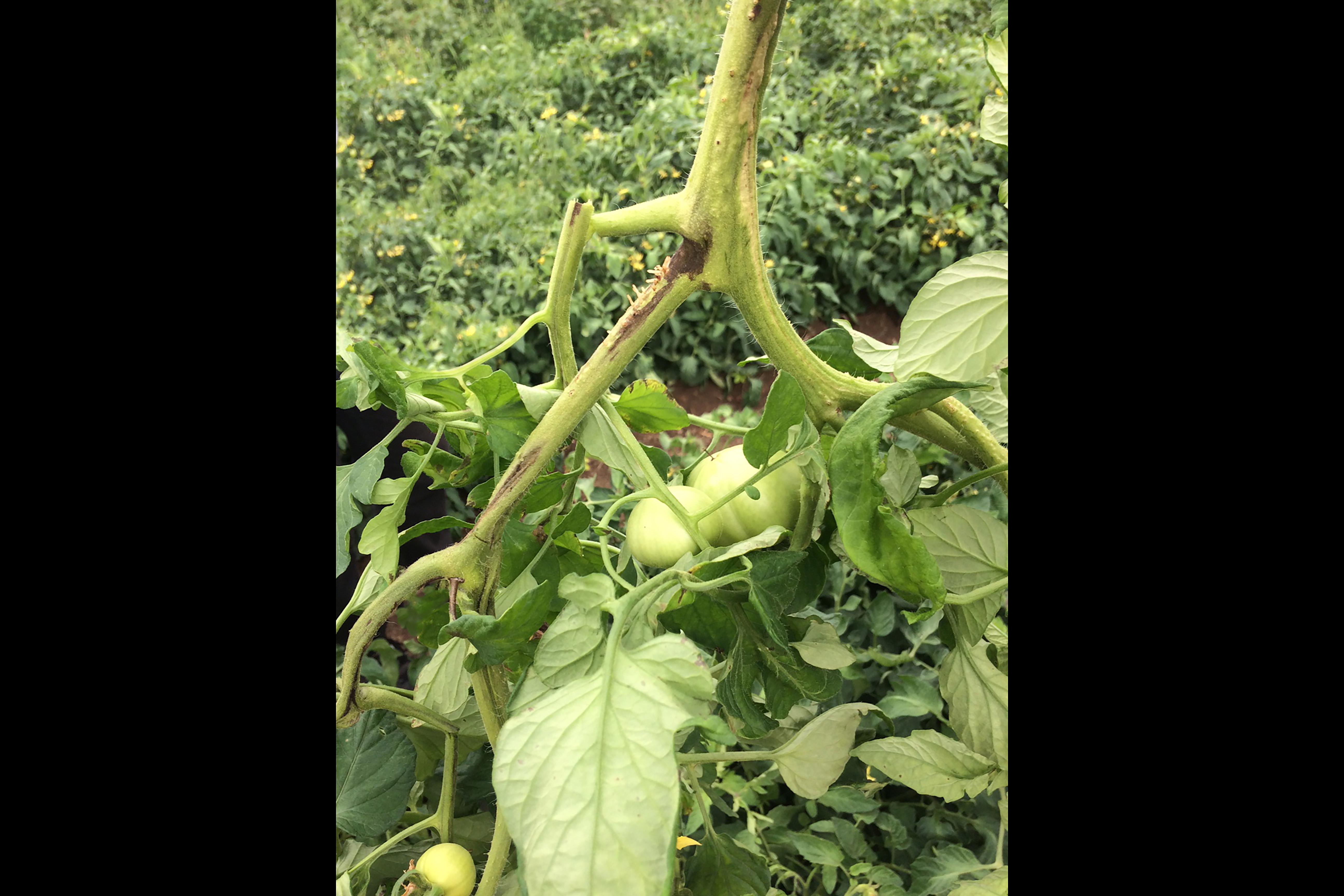 Description: Une vue rapprochée d’une tige de tomate de champ (cv 'Prima Red') montre des racines adventives et un chancre brun à noir dans lequel les tissus s'affaissent. Le chancre progresse également sur le pétiole des feuilles. Les feuilles localisées dans les zones supérieures aux chancres sont jaunes et flétries (peu visible ici). Les tests de laboratoire ont révélé la présence de la bactérie Pseudomonas corrugata, responsable de la moelle noire chez la tomate.