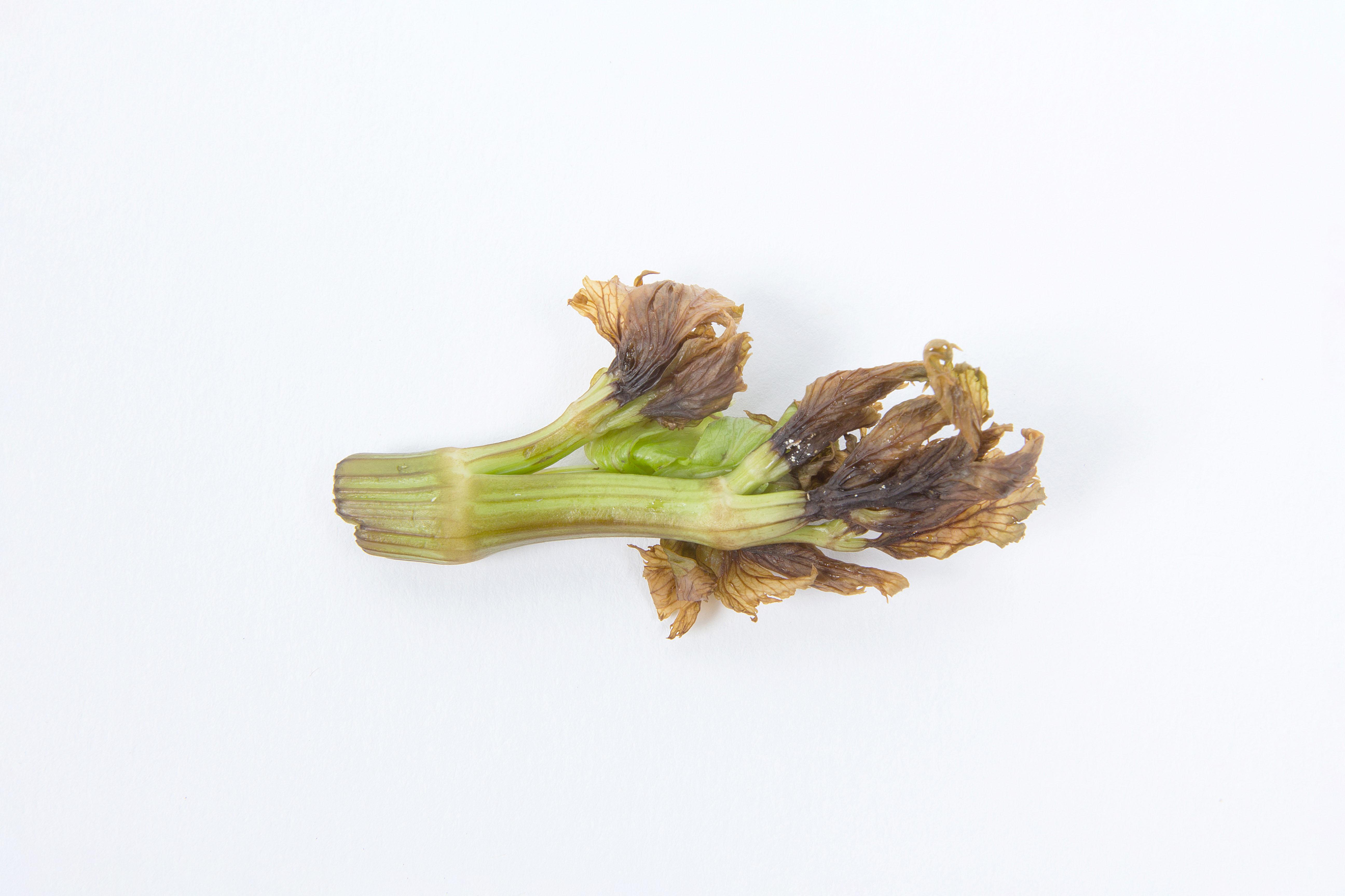 Description: Un morceau de pétiole de céleri provenant du cœur des plants montre une coloration brun-noir de l’extrémité des jeunes feuilles. Une délimitation nette sépare les tissus affectés des tissus d'apparence saine. Le pétiole est un peu tordu. Les tests de laboratoire se sont avérés négatifs pour la détection de champignon et de bactérie. Les dommages s’apparentent à ceux du cœur noir induit par une carence en calcium.
