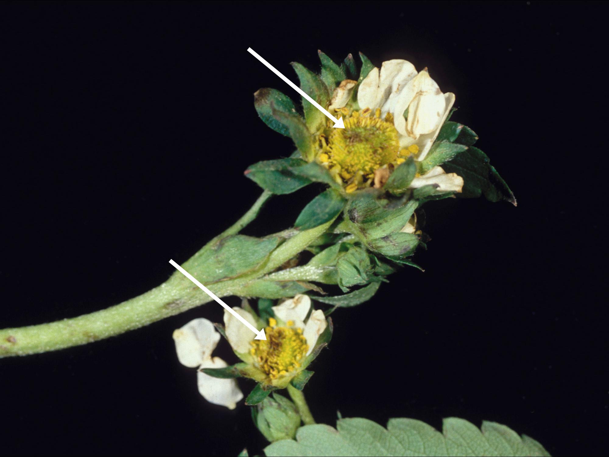 Description: Sur des fleurs de fraisier, présence de taches brunes sur les carpelles (voir flèches). Les taches sont causées par l’impact de la grêle sur les fleurs. Les symptômes ne sont pas évolutifs.