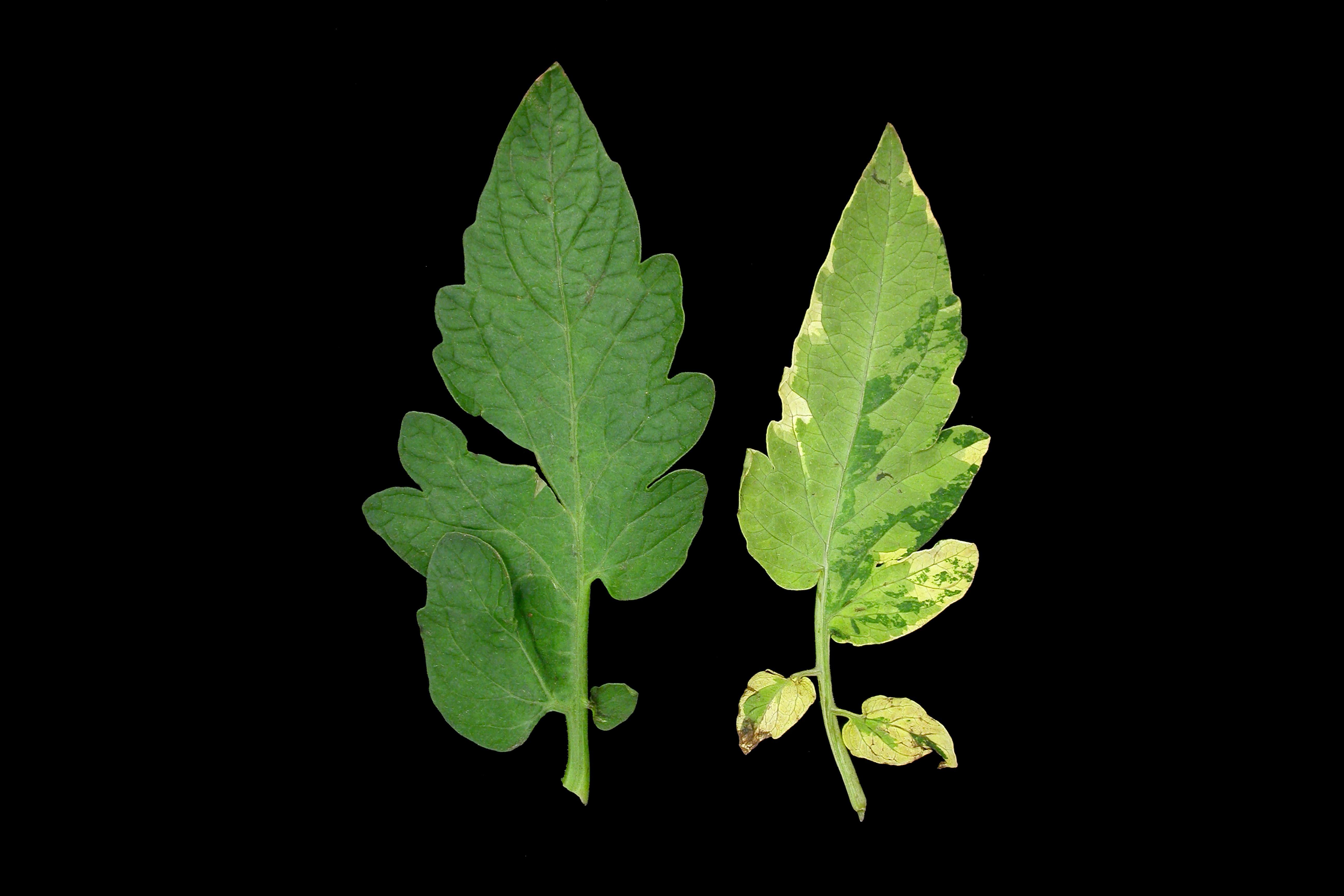 Description: Comparaison entre une foliole de tomate de serre (cv 'Westland') saine et affectée. La foliole affectée montre des plages jaunâtres, dont la marge est bien délimitée des tissus sains. Les symptômes sont observés principalement sur un seul côté du limbe. Aucun virus n’a été détecté des dommages. Ce symptôme est caractéristique d’un désordre génétique appelé argenture.