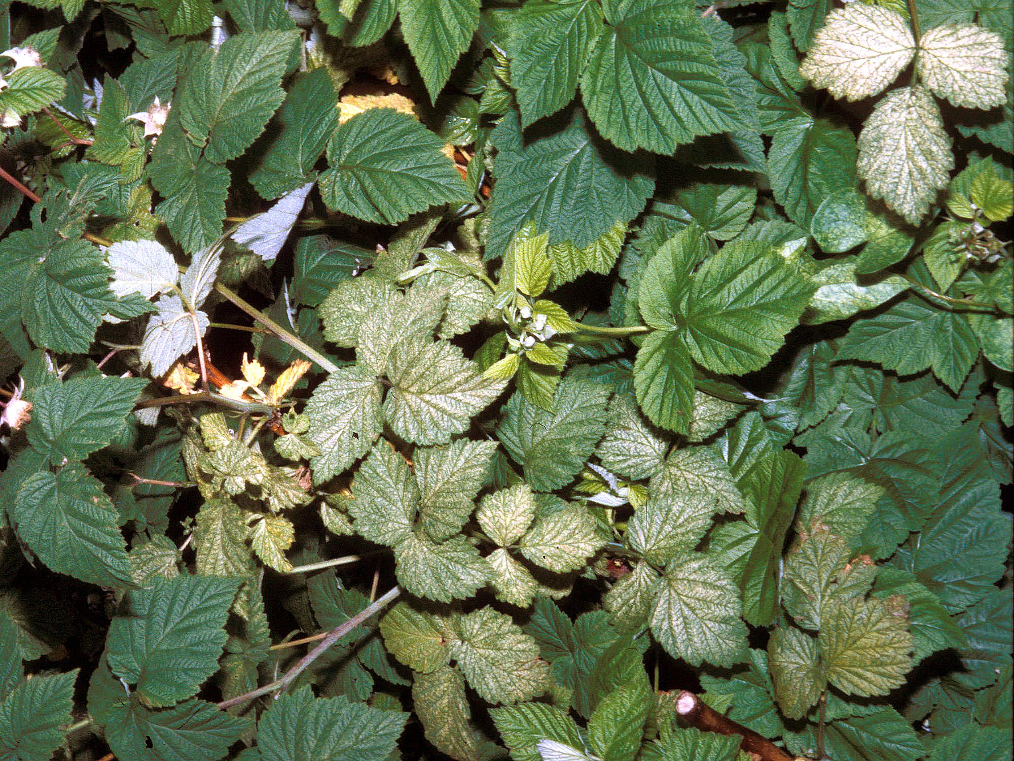 : Dommages causés par le tétranyque de McDaniel sur du feuillage de framboisier