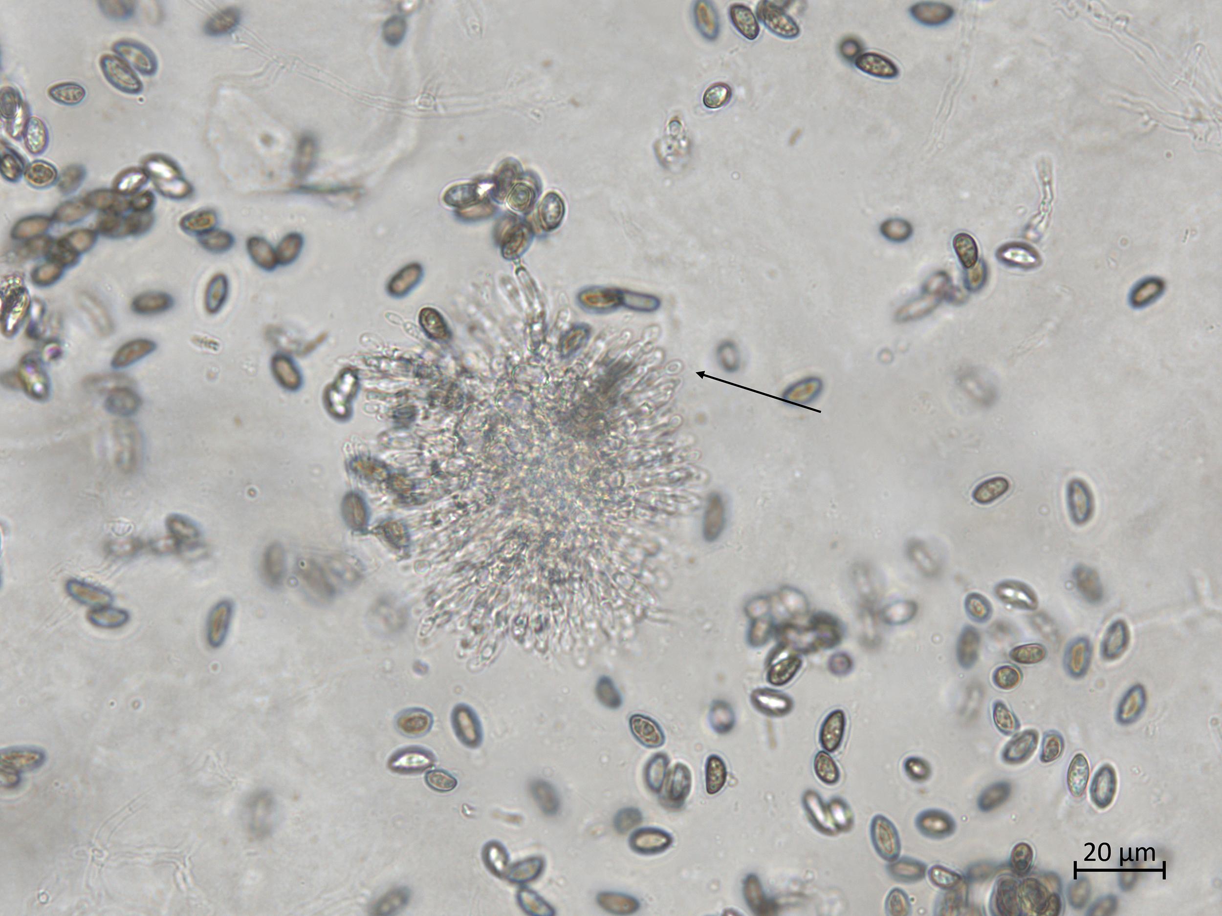 : Conidies de Coniella diplodiella en croissance au bout de leurs conidiophores.