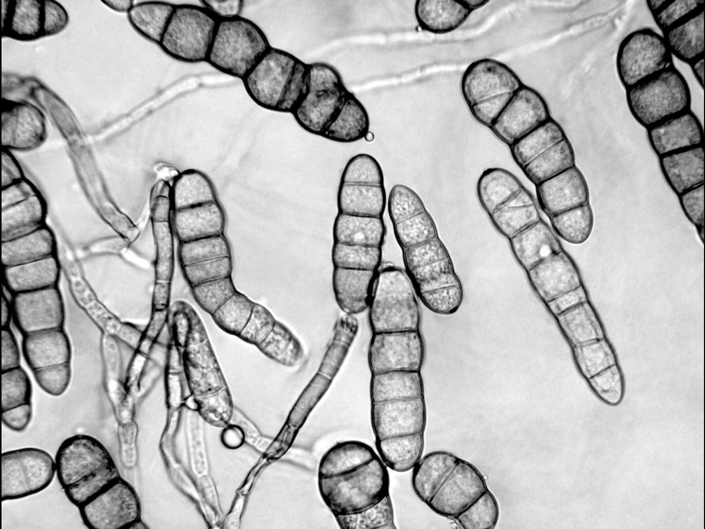 - Conidies : Conidies cylindriques ou obclavées (= en forme de massue inversée). Dictyospores (2-12 septations transversales et 0-1 septation longitudinale ou oblique). Sans rustrum; cellules arrondies aux deux extrémités. Paroi lisse. Hyalines à brunâtres. Constriction au niveau des septations transversales. Conidies généralement solitaires, ou occasionnellement en courte chaîne de 2 conidies. Dimension : 45-145 x 10-30 µm.