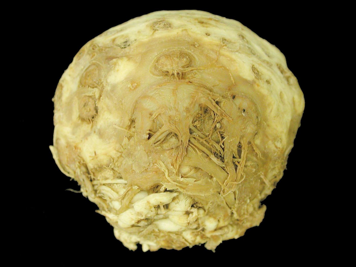 En entrepôt, la maladie se développe généralement 5 à 6 semaines après le début de l’entreposage, lorsque les tissus amorcent leur sénescence. La contamination des racines se produit au moment de la récolte, le champignon se logeant à la surface du sol, au collet et sur le feuillage des plants. Le champignon pénètre par le collet ou l’apex de la racine, là où les symptômes apparaissent.
