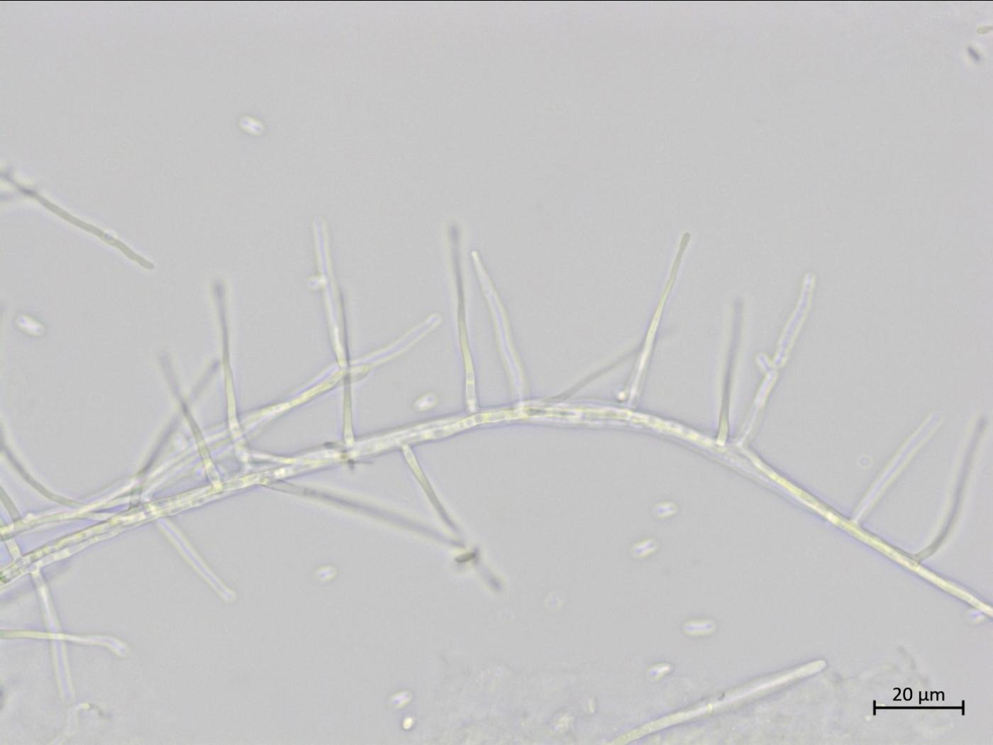 : Hyphes de Sarocladium strictum regroupés en faisceaux avec de longs conidiophores qui en émergent.