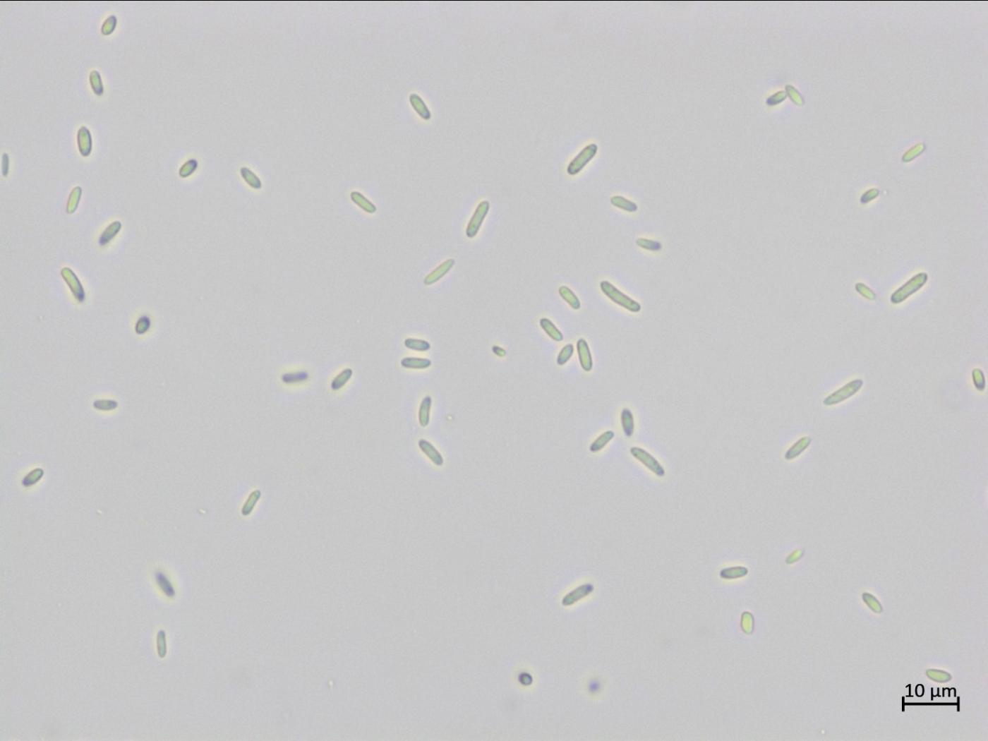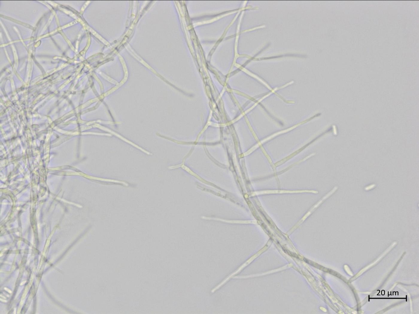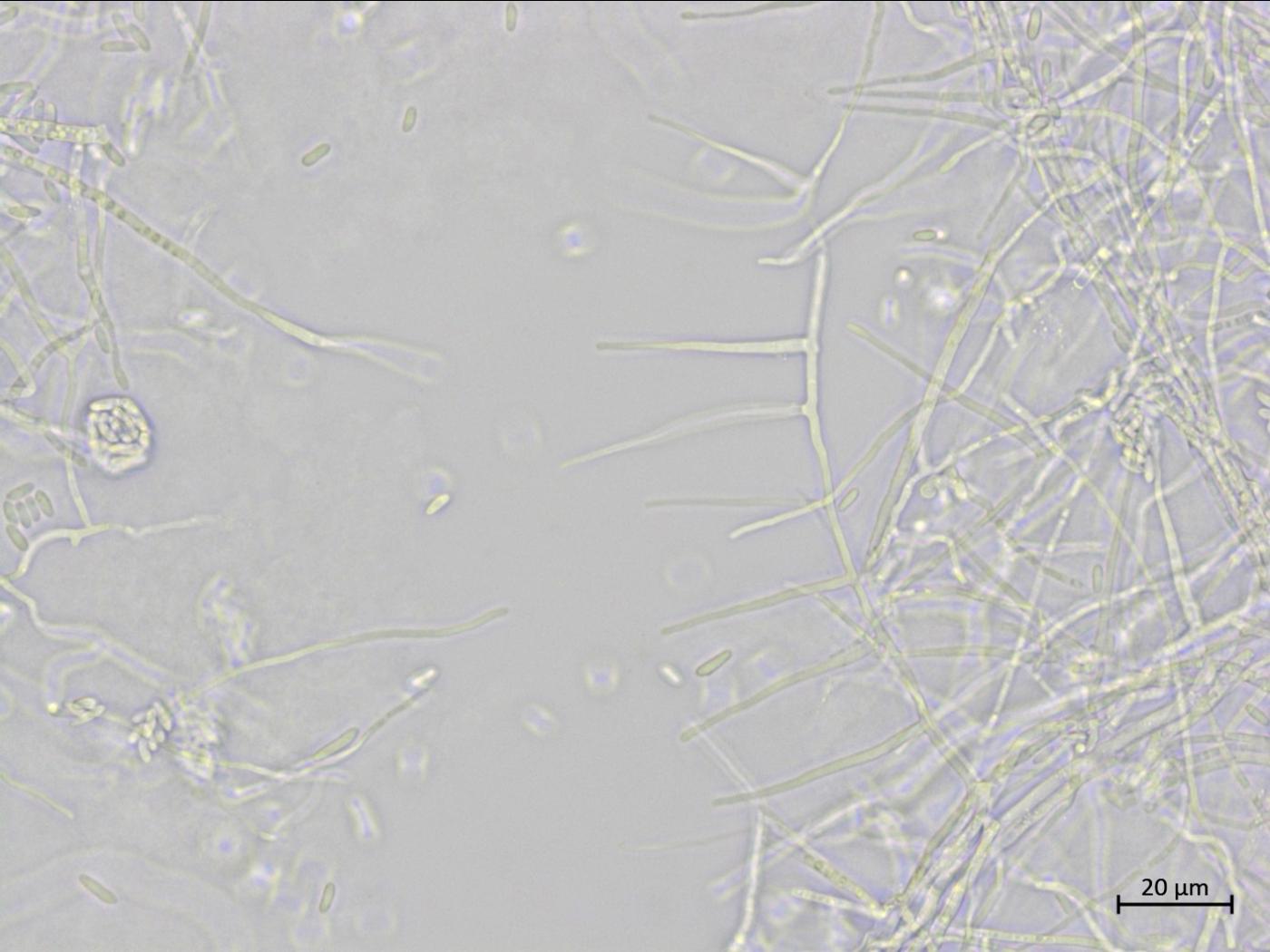 : Hyphes et amas de conidies de Sarocladium strictum.