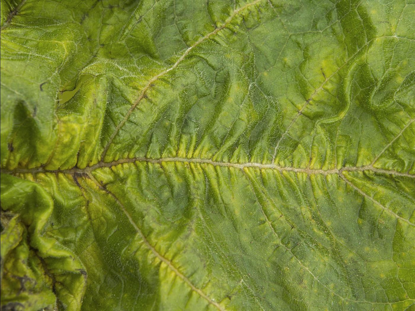 Feuille : présence de mosaïques verte, de marbrures, de malformations, de gaufrage ou d’une réduction du limbe. Le limbe est souvent filiforme.