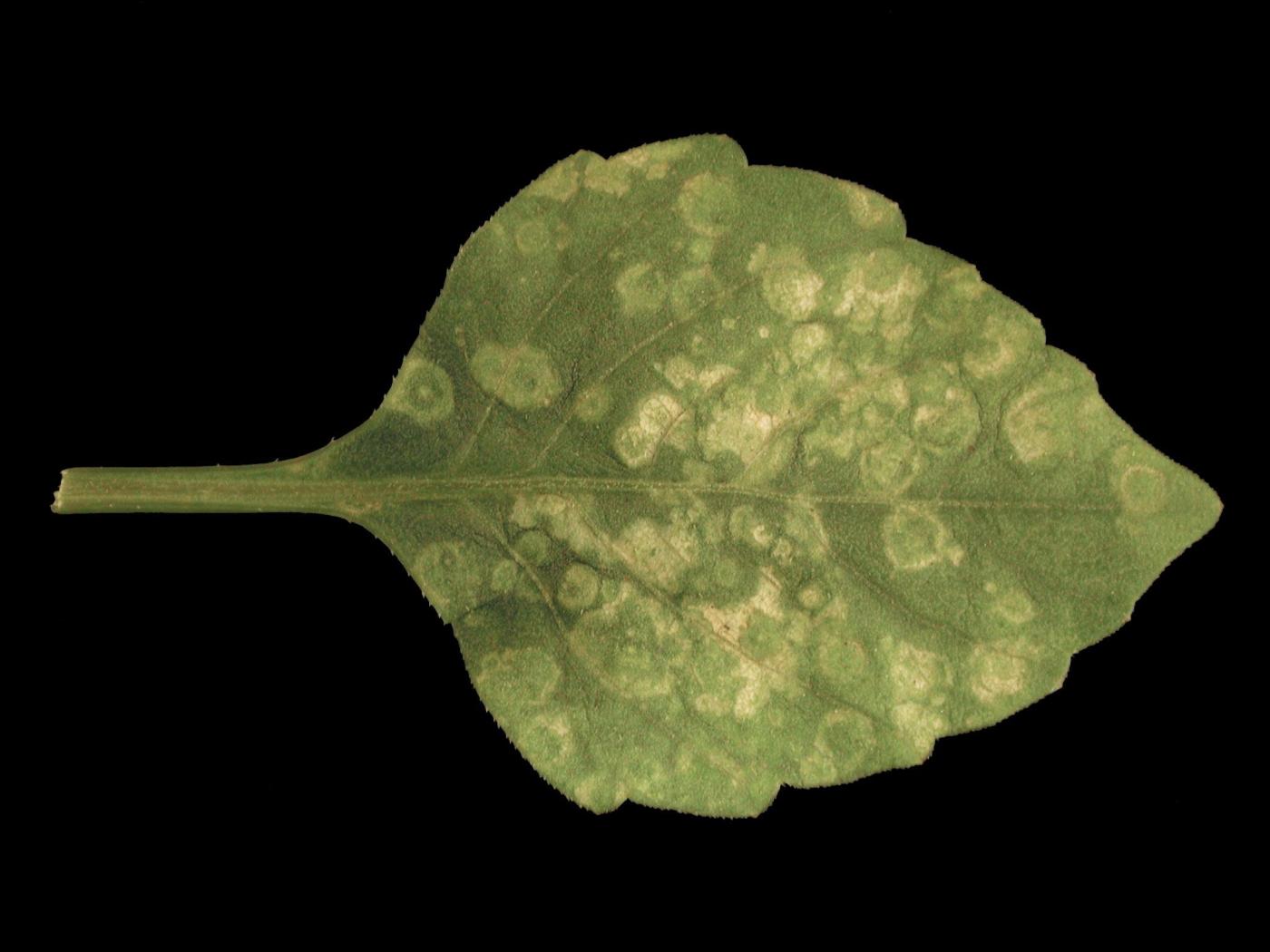 Description: La feuille de dahlia présente des taches circulaires vert pâle à blanchâtres, d’une apparence sèche et ne présentant pas de halo jaune. Le diamètre des taches varie entre 1 et 3 mm. Elles sont réparties au hasard sur le limbe et les feuilles affectées comptent de très nombreuses taches de sorte que le limbe vient à être entièrement recouvert. Les symptômes se retrouvent sur les vieilles feuilles seulement.