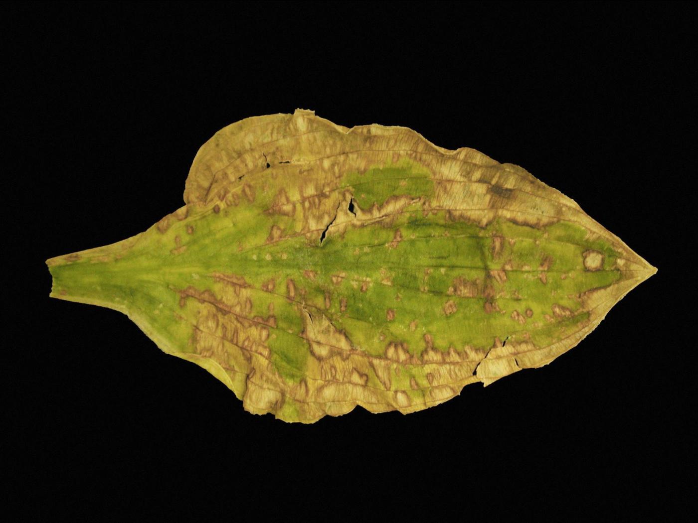 Feuille : le symptôme classique est la présence de taches bleutées ou vertes sur les feuilles claires. Les taches suivent généralement les nervures et diffusent dans les tissus environnants, donnant à la plante une apparence marbrée. D’autres symptômes peuvent être observés comme des mosaïques vert pâle à jaunâtres, du jaunissement le long des nervures, des taches de différentes couleurs, bandes, stries ou points blancs sur feuillage d’un vert uniforme, de brûlures et du gaufrage. Occasionnellement, flétrissement et dépérissement des feuilles.