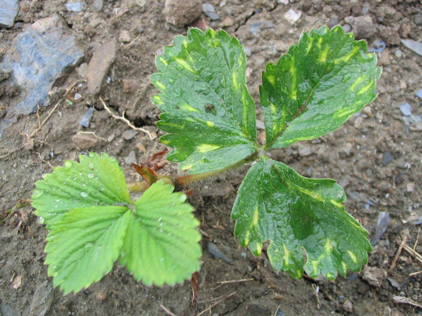 Feuille : présence de taches angulaires blanches à jaunes localisées à la marge, entre les nervures ou de façon symétrique. Parfois limbe déformé et gaufré.