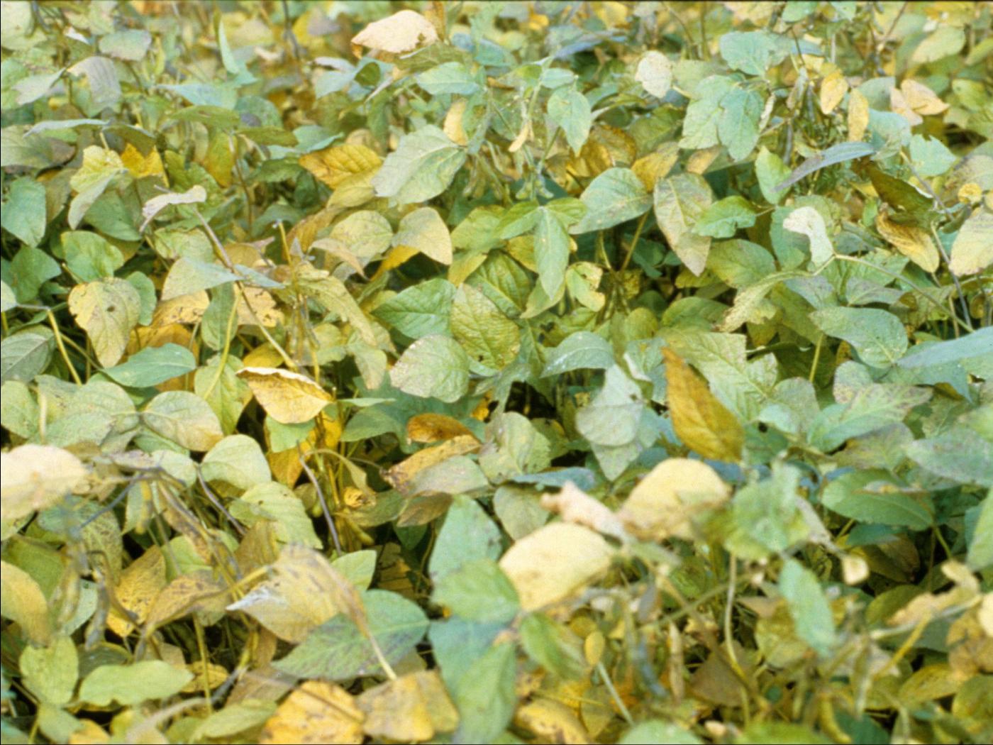 Description: Sur des plants de soya, les feuilles basales et médianes montrent un jaunissement et un brunissement entre les nervures à la face supérieure. Les jeunes feuilles vertes commencent à montrer du bronzage entre les nervures. Ces symptômes sont caractéristiques de dommages causés par l’ozone (O3).