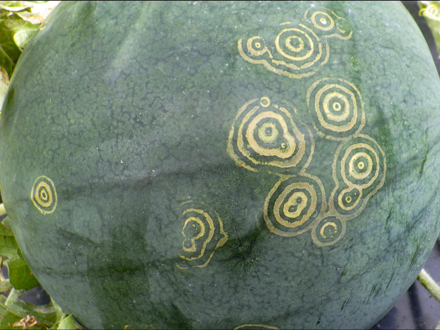 Légende: Anneaux concentriques sur la peau d'un melon de la varitété Sugar baby.