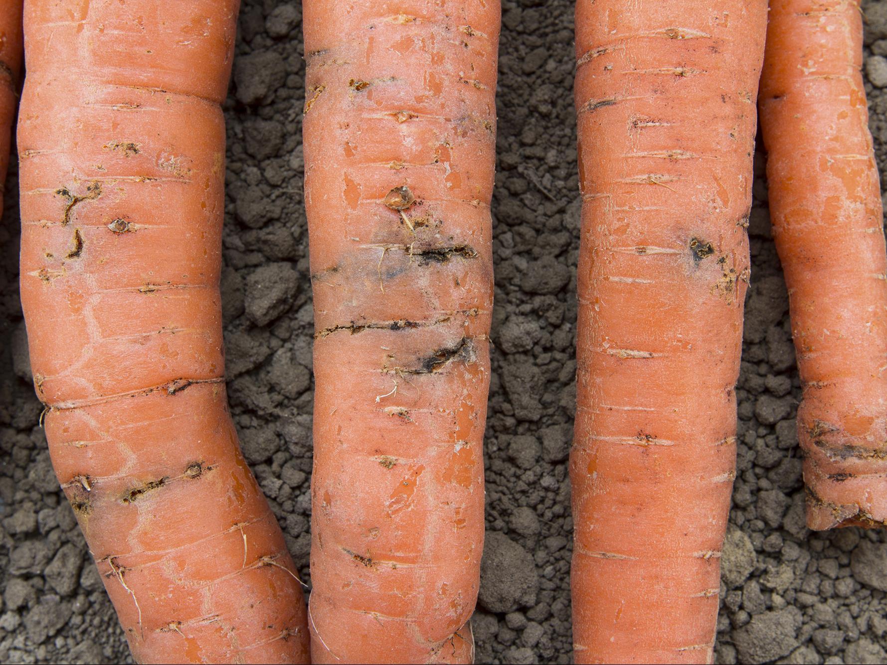 Description: Carotte attaquée par des larves de la mouche de la carotte : la larve de Psila rosae s'attaque aux racines de plusieurs plantes appartenant à la famille des Apiacées. Ce diptère creuse des trous ainsi que des galeries dans le tiers inférieur de la racine pivotante.